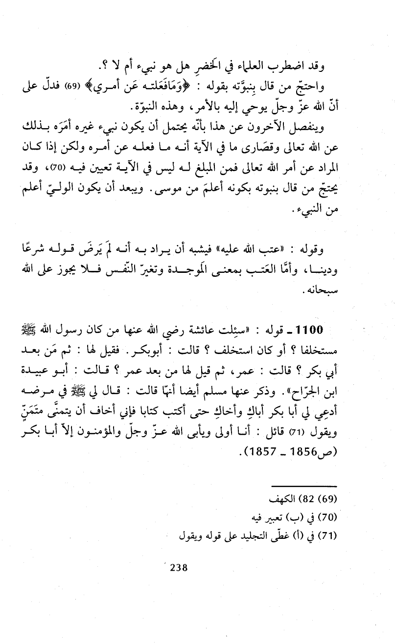 وينفصل الآخرون عن هذا بأنّه يحتمل أن يكون نبيء غيره أمَرَه بذلك عن الله تعالى وقصَارى ما في الآية أنه ما فعله عن أمره ولكن إذا كان المراد عن أمر الله تعالى فمن المبلغ له ليس في الآية تعيين فيه (¬70)، وقد يحتجّ من قال بنبوته بكونه أعلمَ من موسى. ويبعد أن يكون الوليّ أعلم من النبيء.