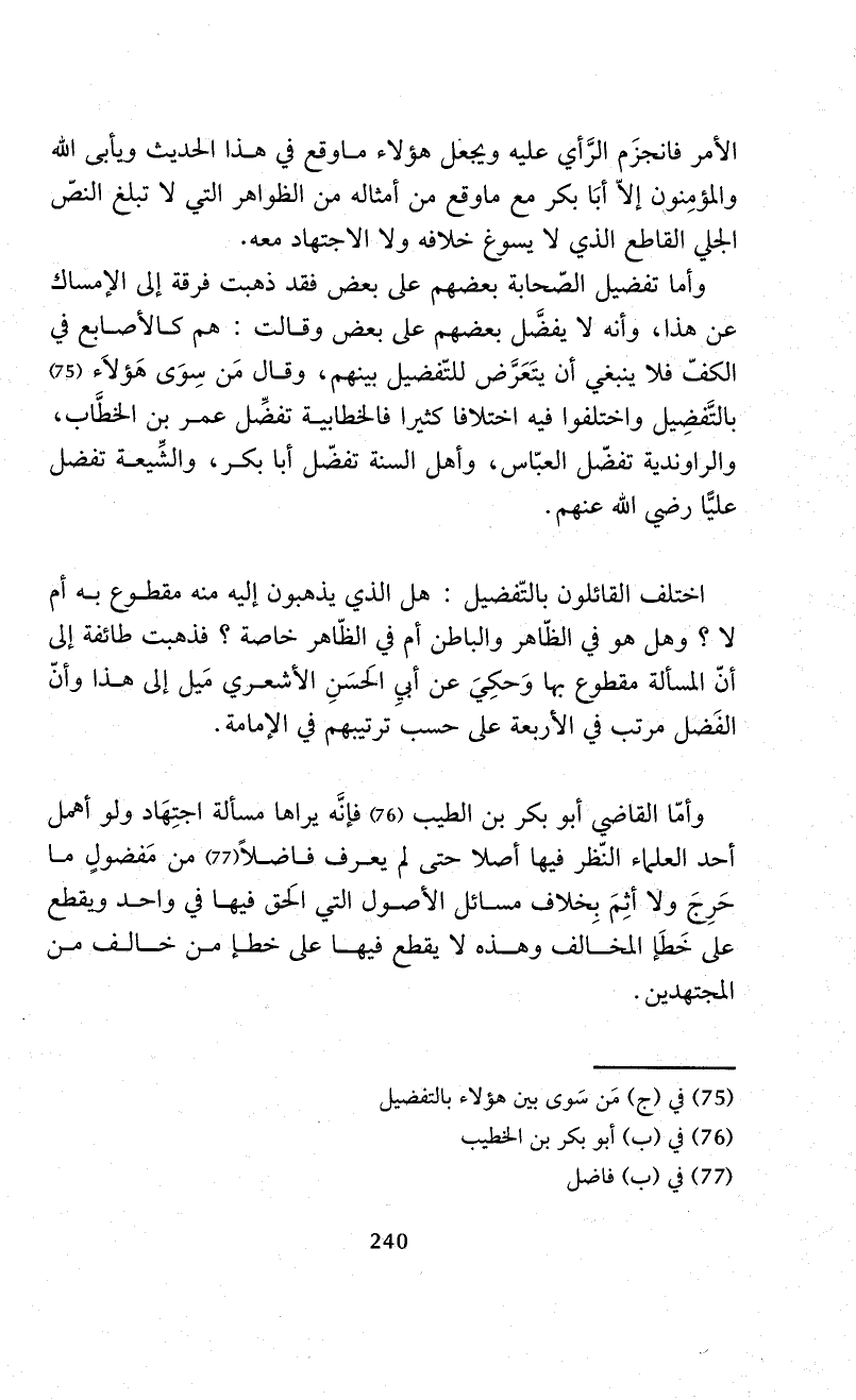 وأمّا القاضي أبو بكر بن الطيب (¬76) فإنَّه يراها مسألة اجتِهَاد ولو أهمل أحد العلماء النّظر فيها أصلا حتى لم يعرف فاضلاً (¬77) من مَفضولٍ ما حَرِجَ ولا أثِمَ بِخلاف مسائل الأصول التي الَحق فيها في واحد ويقطع على خَطَإ المخالف وهذه لا يقطع فيها على خطإ من خالف من المجتهدين.