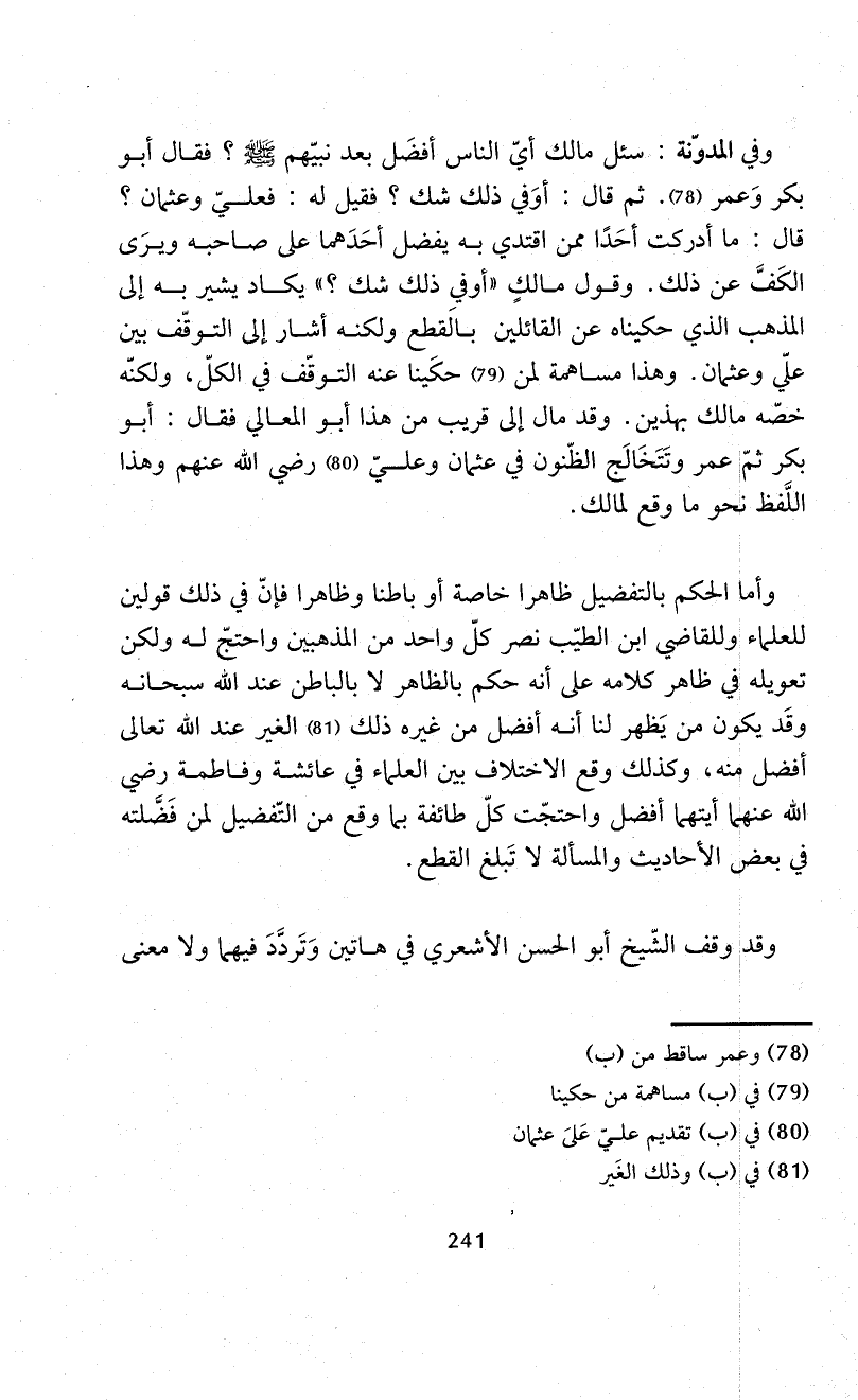 وفي المدوّنة: سئل مالك أيّ الناس أفضَل بعد نبيّهم - صلى الله عليه وسلم -؟ فقال أبو بكر وَعمر (¬78). ثم قال: أوَفي ذلك شك؟ فقيل له: فعليّ وعثمان؟ قال: ما أدركت أحَدًا ممن اقتدي به يفضل أحَدَهما على صاحبه ويرَى الكَفَّ عن ذلك. وقول مالكٍ "أوَفي ذلك شك؟ " يكاد يشير به إلى المذهب الذي حكيناه عن القائلين بالَقطع ولكنه أشار إلى التوقّف بين علّي وعثمان. وهذا مساهمة لمن (¬79) حكَينا عنه التوقّف في الكلّ، ولكنّه خصّه مالك بهذين. وقد مال إلى قريب 8من هذا أبو المعالي فقال: أبو بكر ثمّ عمر وتَتَخَالَج الظّنون في عثمان وعليّ (¬80) -رضي الله عنهم- وهذا اللَّفظ نحو ما وقع لمالك.