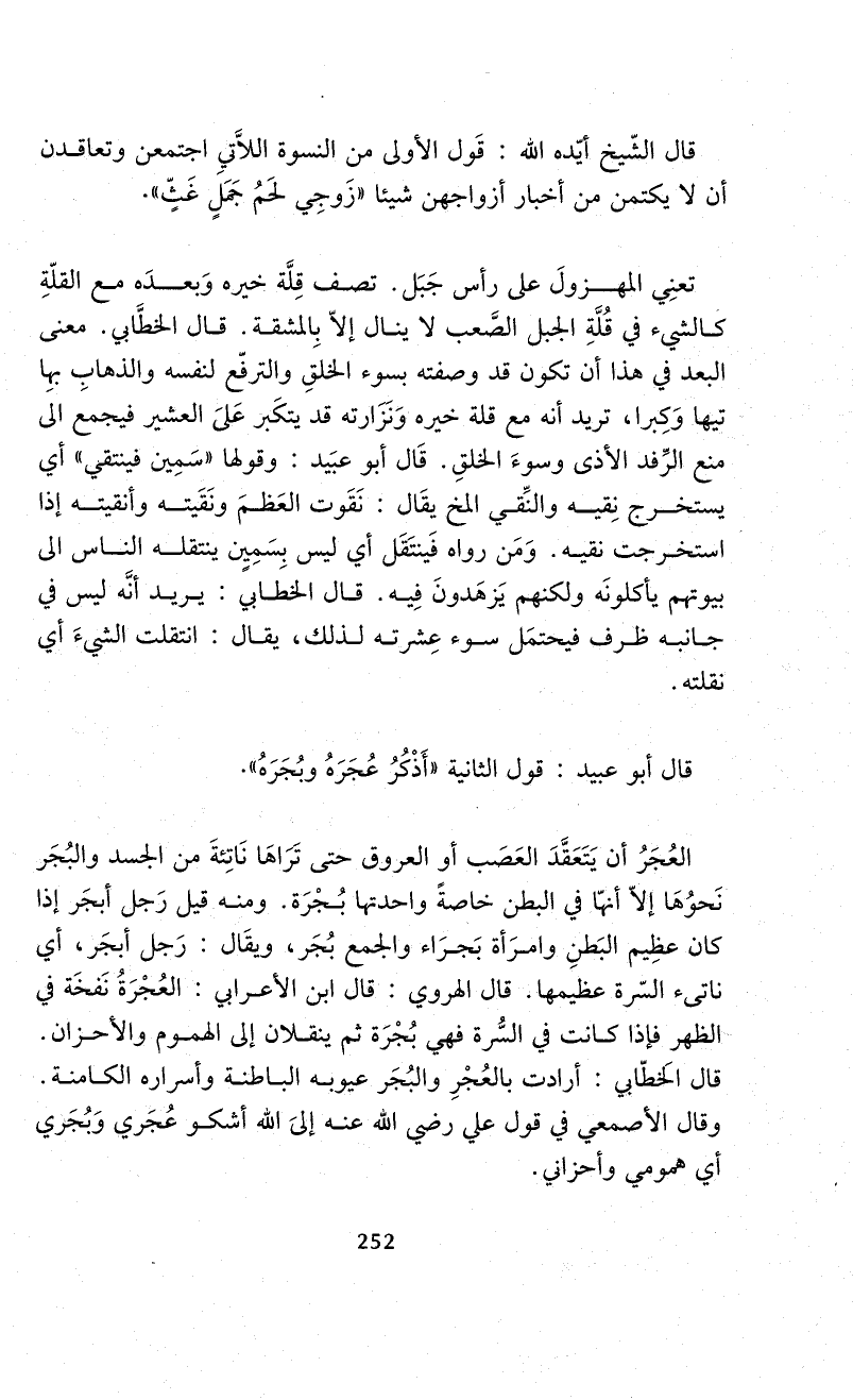 قال أبو عبيد: قول الثانية "أَذْكُرُ عُجَرَهُ وبُجَرَهُ ".