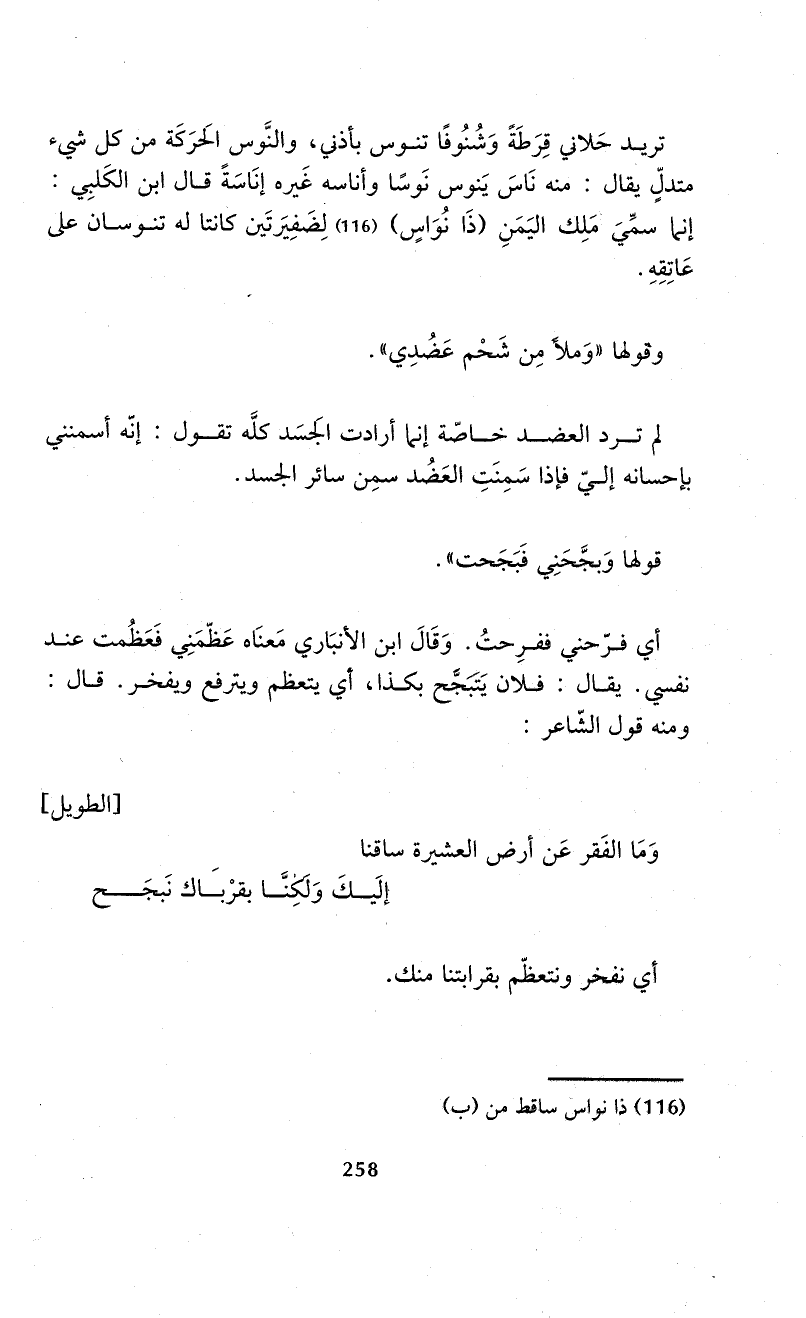 تريد حَلاني قِرَطَةً وَشُنُوفًا تنوس بأذني، والنَّوس الَحرَكَة من كل شيء متدلٍّ يقال: منه نَاسَ يَنوس نَوسًا وأناسه غَيره إنَاسَةً قال ابن الكَلبِي: إنما سمِّيَ مَلِك اليَمَنِ (ذَا نُوَاسٍ) (¬116) لِضَفِيَرتَين كانتا له تنوسان على عَاتِقِهِ.