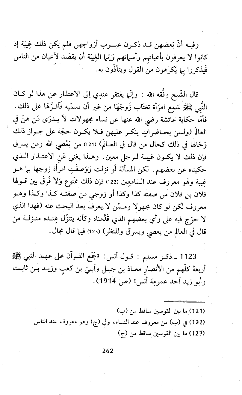 قال الشّيخ وفَّقه الله: وإنّما يفتقر عندِي إلى الاعتذار عن هذا لو كان النَّبِي - صلى الله عليه وسلم - سَمِع امرَأة تغتَاب زَوجَهَا من غير أن تسمّيه فَأقرُّهَا على ذلك. فأمّا حكاية عائشة -رضي الله عنها- عن نساء مجهولات لاَ يدرَي مَن هنّ في العالمَ (ولسن بحاضراتٍ ينكر عليهن فلا يكون حجّة على جواز ذلك وَحَالها في ذلك كحال من قال في العالمَ) (¬121) من يَعْصي الله ومن يسرق فإن ذلك لا يكون غيبة لرجل معين. وهذا يغني عَنِ الاعتذار الذي حكيناه عن بعضهم. لكن المسألة لَو نزلت وَوَصفَتِ امرأة زوجها بما هو غِيبة وهْو معروف عند السامعِين (¬122) فإن ذلك ممَنوع وَلاَ فَرقَ بين قولها فلان بن فلان من صفته كذا وكذا أو زوجي من صفته كذا وكذا وهو معروف لكن لو كان مجهولا وممّن لا يعرف بعد البحث عنه (فهذا الذي لا حرَج فيه على رأي بعضهم الذي قَدَّمناه وكأنه يتنزّل عِنده منزلة من قال في العالم من يعصي ويسرق وللنظر) (¬123) فيما قال مجال.