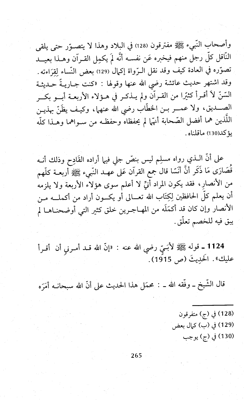 وأصحاب النّبيء - صلى الله عليه وسلم - مفترقون (¬128) في البلاد وهذا لا يتصوّر حتى يلقى النّاقل كلّ رجل منهم فيخبره عَن نفسه أنَّه لمَ يكمِل القرآن وهذا بعيد تصوّره في العادة كيف وقد نقل الرّواة إكمال (¬129) بعض النّساء لِقِرَاءته. وقد اشتهر حديث عائشة -رضي الله عنها- وقولها: "كنت جاريةً حديثة السّنّ لاَ أقرأ كثيرًا من القراّن ولم يذكر في هؤلاء الأربعة أبو بكر الصديق، ولا عمر بن الخطّاب -رضي الله عنهما-، وكيف يظَنّ بهذين اللَّذين هما أفضل الصّحابة أنهّما لم يحفظاه وحفظه من سواهما وهذا كلّه يؤكد (¬130) ما قلناه.