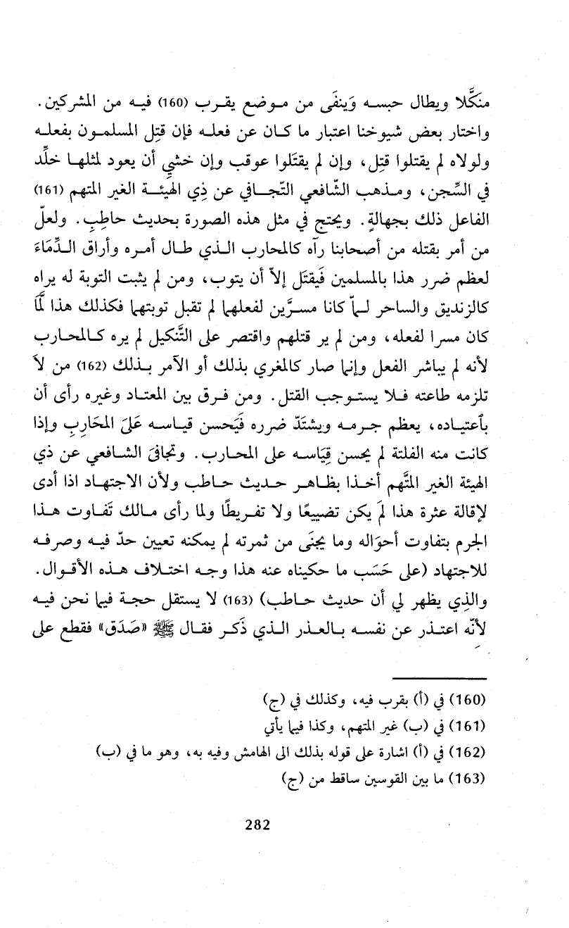 واختار بعض شيوخنا اعتبار ما كان عن فعله فإن قتِل المسلمون بفعله ولولاه لم يقتلوا قتِل، وإن لم يقتَلوا عوقب وإن خشيِ أن يعود لمثلها خلِّد في السِّجن، ومذهب الشّافعي التّجافي عن ذِي الهيئة الغير المتهم (¬161) الفاعل ذلك بجهالةٍ. ويحتج في مثل هذه الصورة بحديث حاطِبِ. ولعلّ من أمر بقتله من أصحابنا رآه كالمحارب الذي طال أمره وأراق الدِّمَاءَ لعظم ضرر هذا بالمسلمين فَيقتَل إلاّ أن يتوب، ومن لم يثبت التوبة له يراه كالزنديق والساحر لماّ كانا مسرَّين لفعلهما لم تقبل توبتهما فكذلك هذا لمَّاَ كان مسرا لفعله، ومن لم ير قتلهم واقتصر على التَّنكيل لم يره كالمحارب لأنه لم يباشر الفعل وإنما صار كالمغري بذلك أو الآمر بذلك (¬162) من لاَ تلزمه طاعته فلا يستوجب القتل. ومن فرق بين المعتاد وغيره رأى أن باعتياده، يعظم جرمه ويشتَدّ ضرره فَيَحسن قياسه عَلىَ المحَارِبِ وإذا كانت منه الفلتة لم يحسن قِيَاسه على المحارب. وتجافىَ الشافعي عن ذي الهيئة الغير المتَّهم أخذا بظاهر حديث حاطب ولأن الاجتهاد إذا أدى لإقالة عثرة هذا لمَ يكن تضييعًا ولا تفريطًا ولما رأى مالك تَفاوت هذا الجرم بتفاوت أحوَاله وما يجنَى من ثمرته لم يمكنه تعيين حدّ فيه وصرفه للاجتهاد (على حَسَب ما حكيناه عنه هذا وجه اختلاف هذه الأقوال.