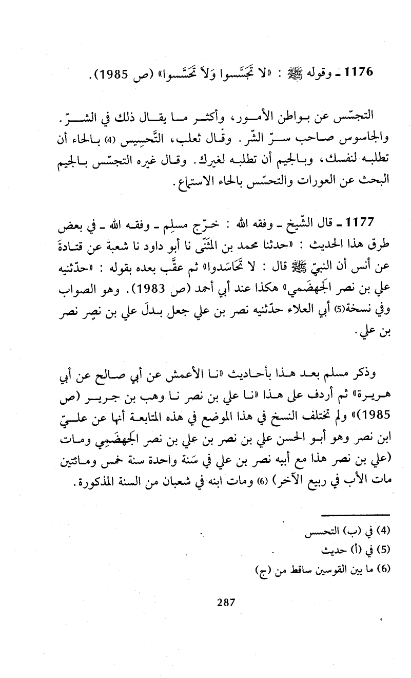 1176 - وقوله - صلى الله عليه وسلم -: "لا تَجَسَّسوا وَلاَ تَحَسَّسوا" (ص 1985).