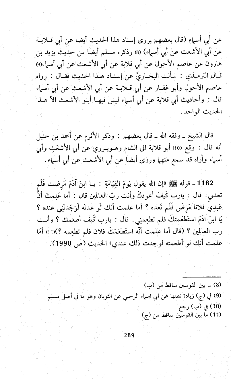 1182 - قوله - صلى الله عليه وسلم - "إن الله يقول يَومَ القِيَامَةِ: يا ابنَ آدَمَ مَرِضت فَلَم تعدنيِ. قال: يارب كَيفَ أعودكَ وأنت ربّ العالمين قال: أما عَلِمتَ أنَّ عَبدِي فلانا مَرِضَ فَلَم تَعده؟ أما علمت أنك لَو عدتَه لَوَجَدتَنِي عنده؟ يَا ابنَ آدَمَ استَطعَمتكَ فلم تطعِمنِي. قال: يارب كَيف أطعمك؟ وأنت رب العالمين؟ (قال أما علمت أنّه استَطعَمَكَ فلان فلم تطعِمه؟) (¬11) أمَا علمت أنك لو أطعمته لوجدت ذلك عندي" الحديث (ص 1990).