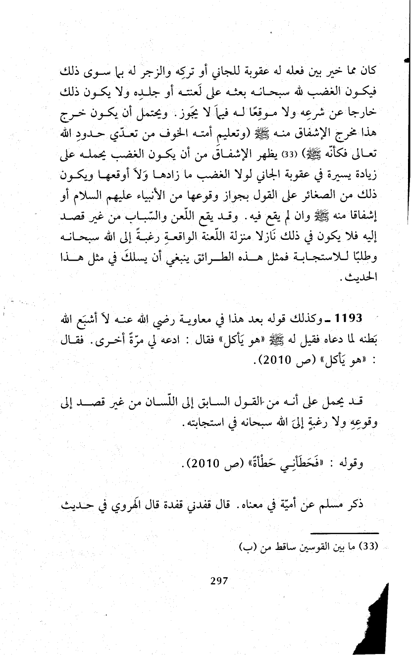 1193 - وكذلك قوله بعد هذا في معاوية -رضي الله عنه- لاَ أشبَع الله بَطنه لما دعاه فقيل له - صلى الله عليه وسلم - "هو يَأكل" فقال: ادعه لي مرّةً أخرى. فقال: "هو يَأكل" (ص 2010).