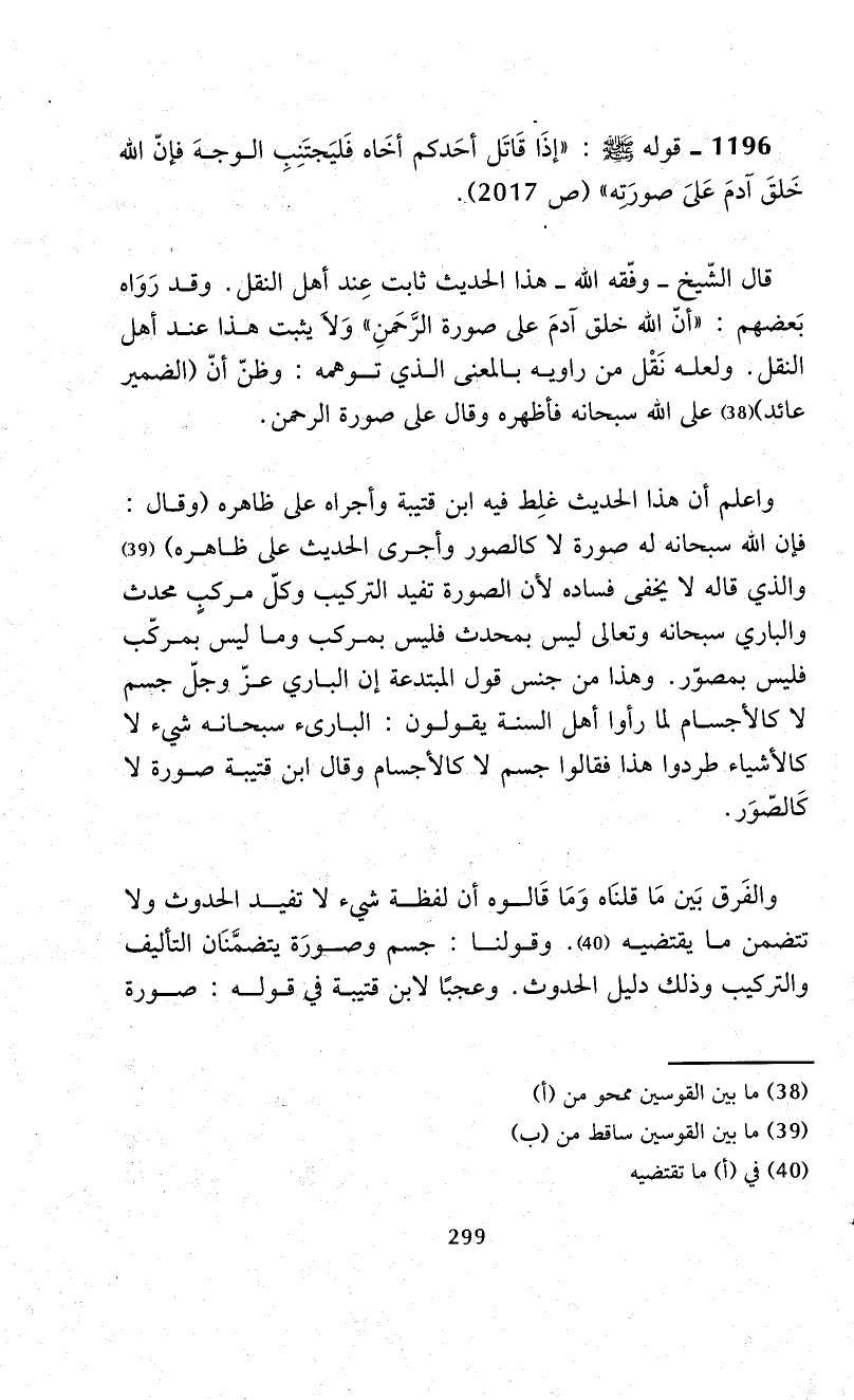 1196 - قوله - صلى الله عليه وسلم -: "إذَا قَاتَل أحَدكم أخَاه فَليَجتَنِبِ الوجهَ فإنّ الله خَلقَ آدمَ عَلىَ صورَتِه" (ص 2017).