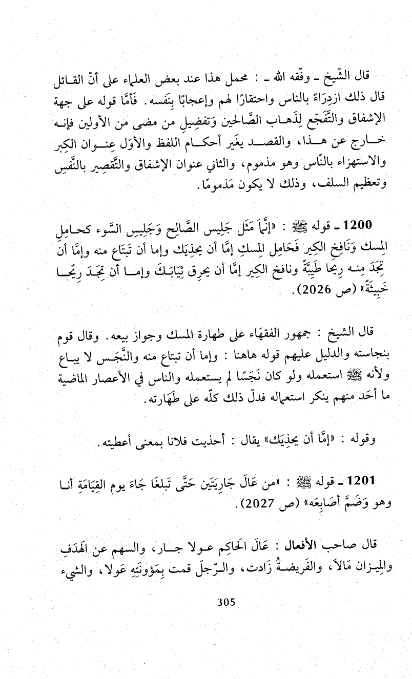 1200 - قوله - صلى الله عليه وسلم -: "إنَّماَ مَثَل جَلِيس الصَالِح وَجَلِيسِ السوء كحامِلِ الِمسك وَنَافِخِ الكِير فَحَامِل الِمسكِ إمَّا أن يحذِيَك وإما أن تَبتَاع منه وإمَّا أن تِجَدَ مِنه رِيحًا طَيِبَّةً ونافخ الكِير إمَّا أن يحرِق ثِيَابَكَ وإما أن تجَدَ ريحًا خَبِيثَةً" (ص 2026).