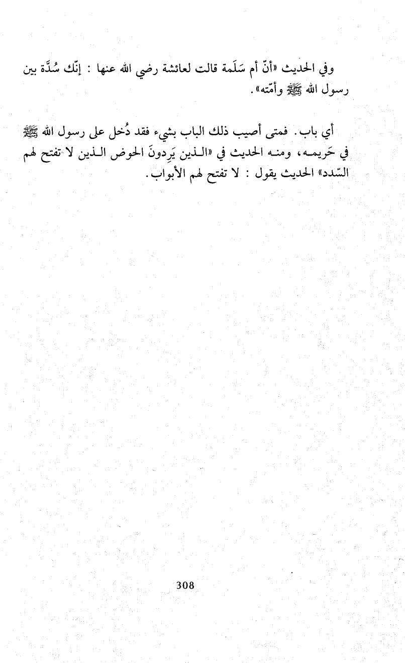 أي باب. فمتى أصيب ذلك الباب بشيء فقد دُخل على رسول الله - صلى الله عليه وسلم - في حَريمه، ومنه الحديث في "الذين يَرِدونَ الحوض الذين لا تفتح لهم السّدد" الحديث يقول: لا تفتح لهم الأبواب.
