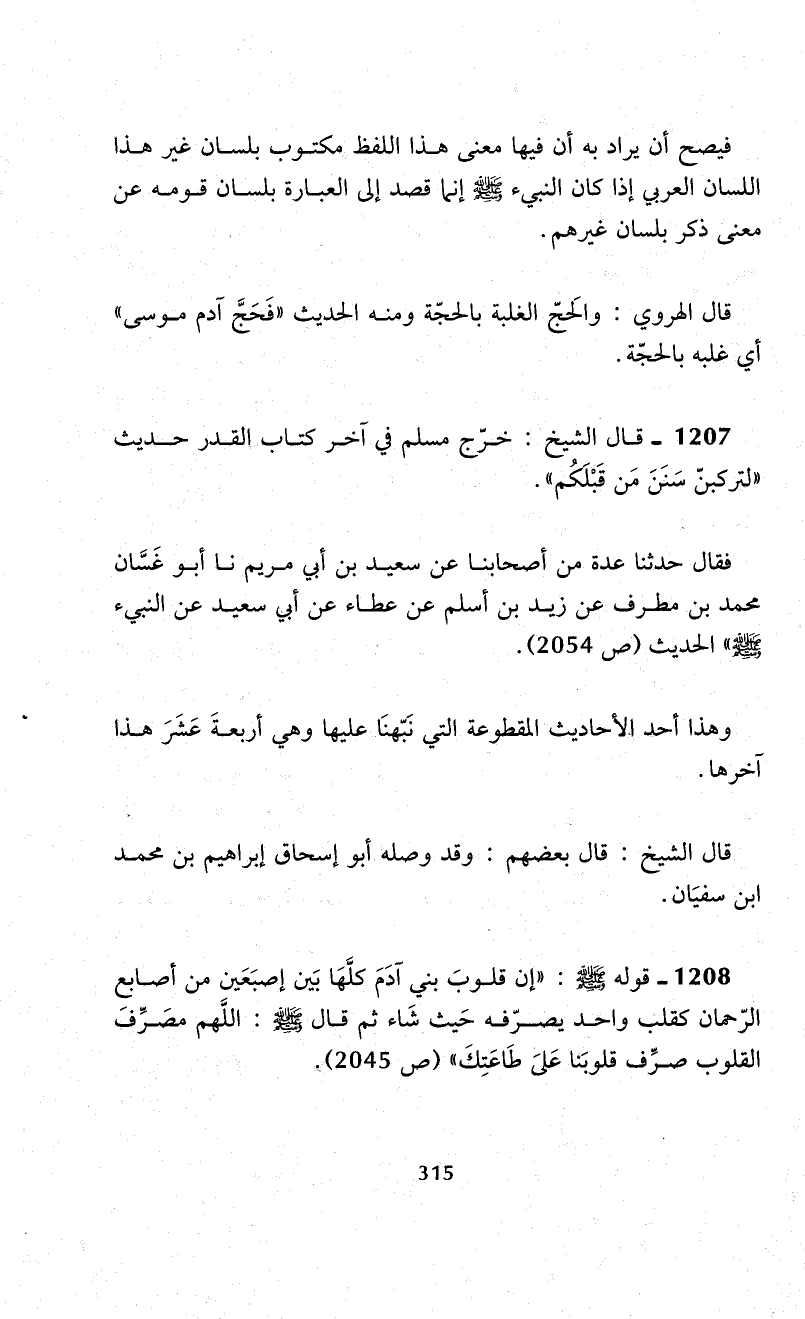 1208 - قوله - صلى الله عليه وسلم -: "إن قلوبَ بني آدَمَ كلَّهَا بَين إصبَعَين من أصابع الرّحمان كقلب واحد يصرّفه حَيث شَاء ثم قال - صلى الله عليه وسلم -: اللَّهم مصَرِّفَ القلوب صرِّف قلوبَنا عَلىَ طَاعَتِكَ" (ص 2045)