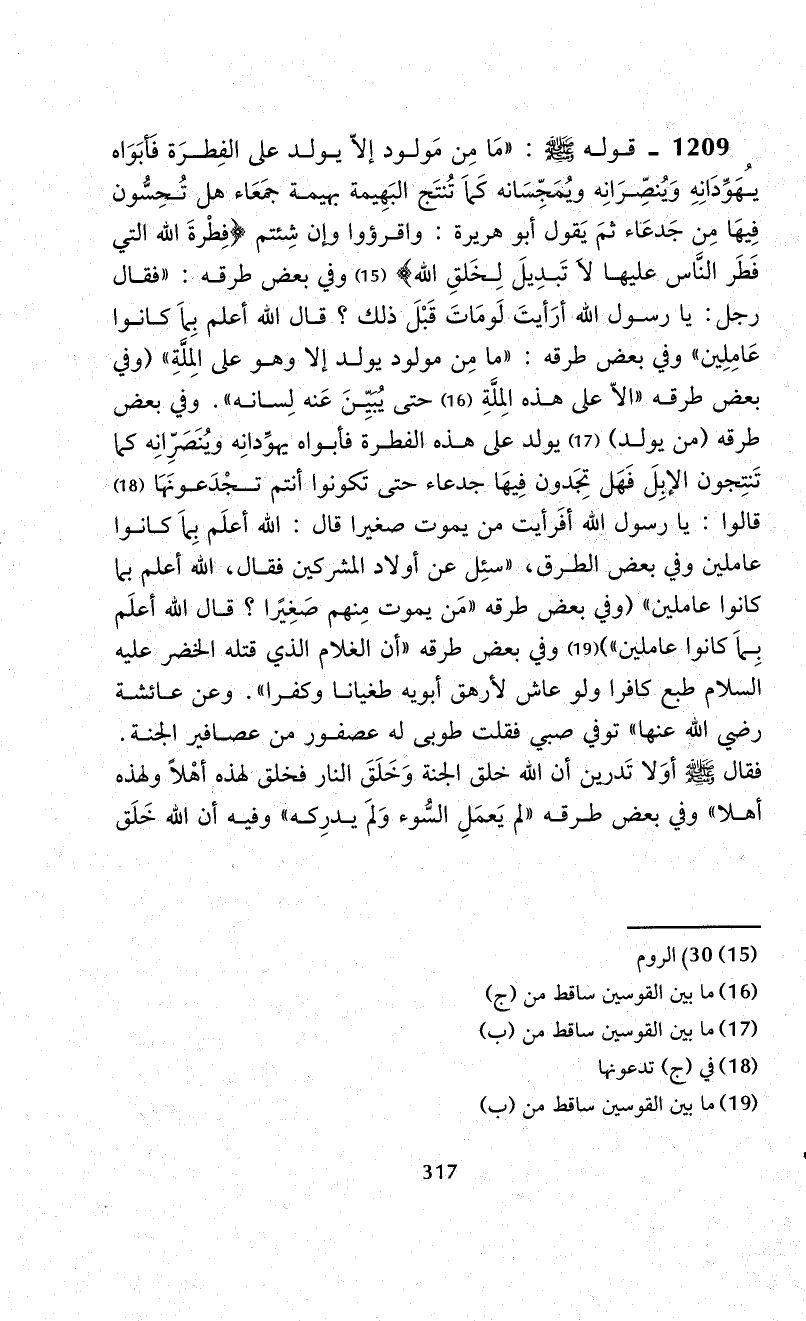 1209 - قوله - صلى الله عليه وسلم -: "مَا مِن مَولود إلاّ يولد على الفِطرَة فَأبَوَاه يُهَوِّدَانِهِ وَيُنصِّرَانِه ويُمَجِّسَانه كَماَ تُنتَج البَهِيمة بهيمة جمَعَاء هل تُحِسُّون فِيهَا مِن جَدعَاء ثمَ يَقول أبو هريرة: واقرؤوا وإن شِئتم {فِطْرَتَ اللَّهِ الَّتِي فَطَرَ النَّاسَ عَلَيْهَا لَا تَبْدِيلَ لِخَلْقِ اللَّهِ} (¬15) وفي بعض طرقه: "فقال رجل: يا رسول الله أرَأيتَ لَو مَاتَ قَبْلَ ذلك؟ قال الله أعلم بِماَ كانوا عَامِلِين" من بعض طرقه: "ما مِن مولود يولد إلا وهو على الِملَّةِ" (وفي بعض طرقه "الاّ على هذه الِملَّةِ (¬16) حتى يُبَيِّنَ عَنه لِسانه". وفي بعض طرقه (من يولد) (¬17) يولد على هذه الفطرة فأبواه يهوِّدانِه ويُنَصَرِّانِه كما تَنتِجون الإبِلَ فَهَل تِجَدون فِيهَا جدعاء حتى تكونوا أنتم تجْدَعونَهَا (¬18) قالوا: يا رسول الله أفَرأيت من يموت صغيرا قال: الله أعلَم بِماَ كانوا عاملين وفي بعض الطرق، "سئِل عن أولاد المشركين فقال، "الله أعلم بما كانوا عاملين" (وفي بعض طرقه "مَن يموت مِنهم صَغِيًرا؟ قال الله أعلَم بِماَ كانوا عاملين") (¬19) وفي بعض طرقه "أن الغلام الذي قتله الخضر عليه السلام طبع كافرا ولو عاش لأرهق أبويه طغيانا وكفرا". وعن عائشة -رضي الله عنها-" توفي صبي فقلت طوبى له عصفور من عصافير الجنة. فقال - صلى الله عليه وسلم - أوَلا تَدرين أن الله خلق الجنة وَخَلَقَ النار فخلق لهذه أهْلاً ولهذه أهلا" وفي بعض طرقه "لم يَعمَلِ السُّوء وَلمَ يدرِكه" وفيه أن الله خَلَق