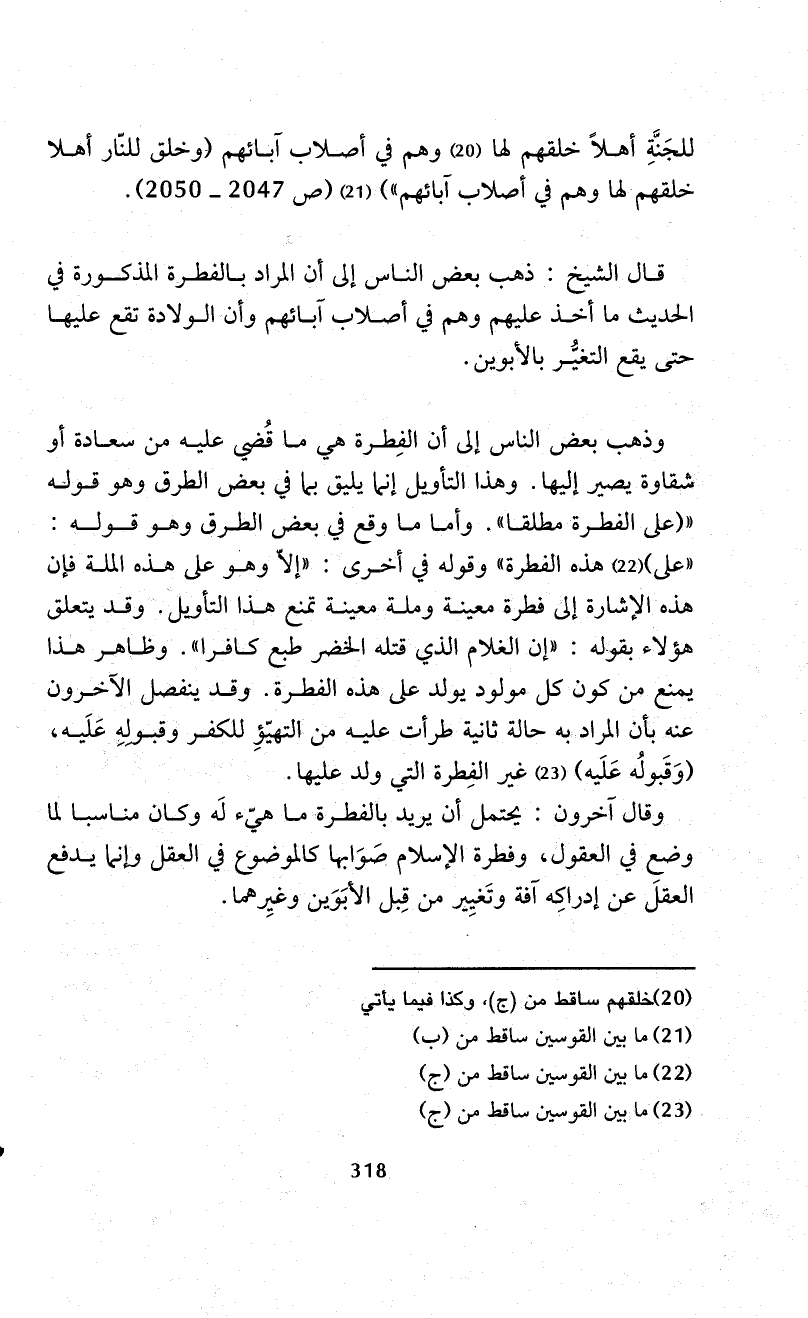 قال الشيخ: ذهب بعض الناس إلى أن المراد بالفطرة المذكورة في الحديث ما أخذ عليهم وهم في أصلاب آبائهم وأن الولادة تقع عليها حتى يقع التغيُّر بالأبوين.