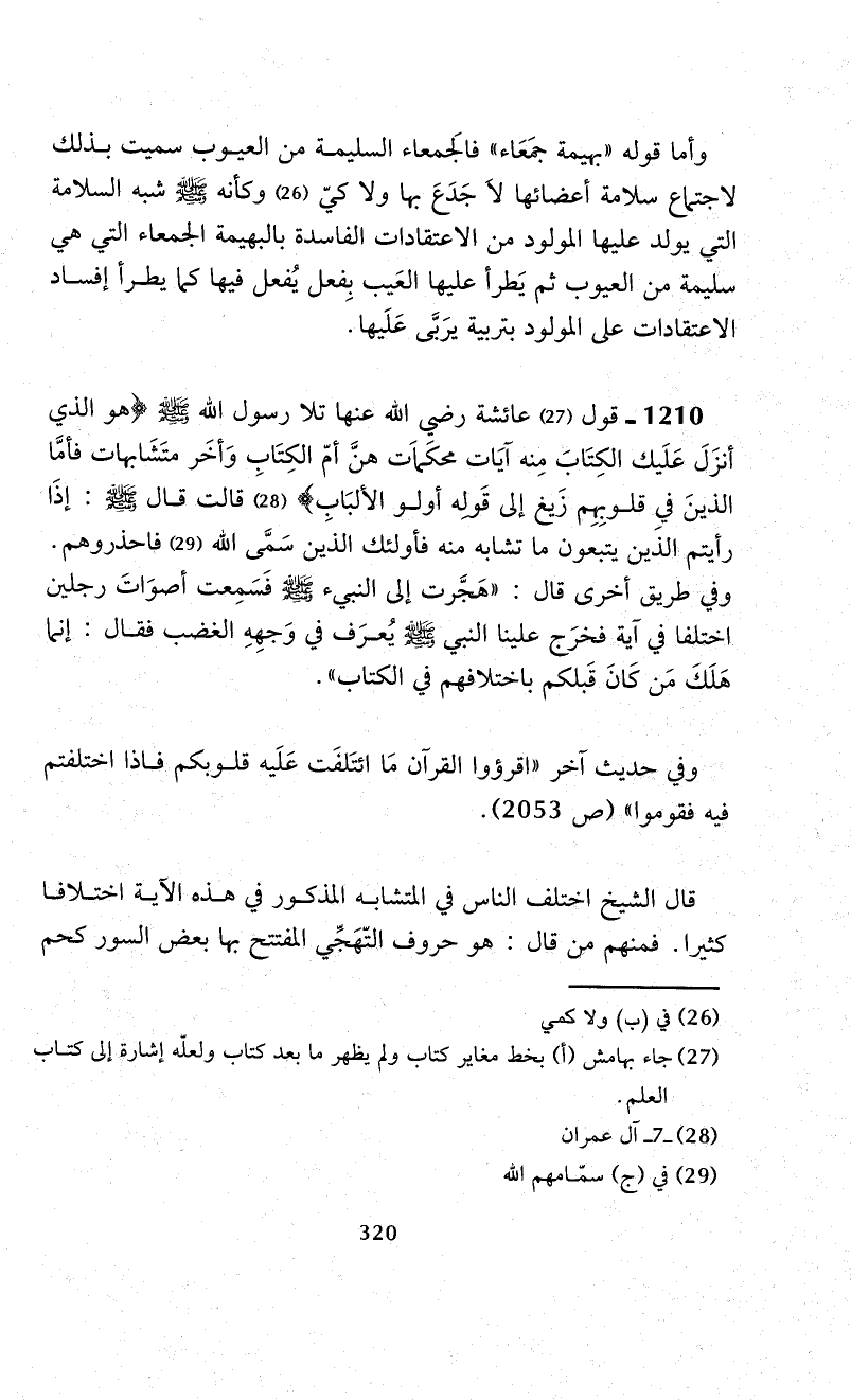 1210 - قول (¬27) عائشة -رضي الله عنها- تلا رسول الله - صلى الله عليه وسلم - {هُوَ الَّذِي أَنْزَلَ عَلَيْكَ الْكِتَابَ مِنْهُ آيَاتٌ مُحْكَمَاتٌ هُنَّ أُمُّ الْكِتَابِ وَأُخَرُ مُتَشَابِهَاتٌ فَأَمَّا الَّذِينَ فِي قُلُوبِهِمْ زَيْغٌ} إلى قَولِه {أُولُو الْأَلْبَابِ} (¬28) قالت قال - صلى الله عليه وسلم -: إذَا رأيتم الذَين يتبعون ما تشابه منه فأولئك الذين سَمَّى الله (¬29) فاحذروهم.