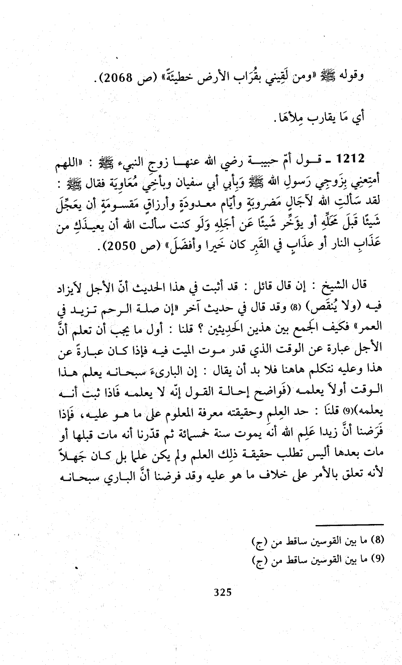 قال الشيخ: إن قال قائل: قد أثبت في هذا الحديث أنّ الأجل لاَ يزاد فيه (ولا يُنقَص) (¬8) وقد قال في حديث آخر "إن صلة الرحم تزيد في العمر" فكيف الجَمع بين هذين الحدِيثين؟ قلنا: أول ما يجب أن تعلم أنَّ الأجل عبارة عن الوقت الذي قدر موت الميت فيه فإذا كان عبارةً عن هذا وعليه نتكلم ها هنا فلا بد أن يقال: إن البارىءَ سبحانه يعلم هذا الوقت أولاَ يعلمه (فَواضح إحالة القول إنّه لا يعلمه فَإذا ثبت أنه يعلمه) (¬9) قلنَا: حد العِلمِ وحقيقته معرفة المعلوم على ما هو عليه، فَإذا فَرَضنا أنَّ زيدا عَلِم الله أنه يموت سنة خمسمائة ثم قدّرنا أنه مات قبلها أو مات بعدها أليس تطلب حقيقة ذلِك العلم ولم يكن علما بل كان جَهلاً لأنه تعلق بالأمر على خلاف ما هو عليه وقد فرضنا أنَّ الباري سبحانه