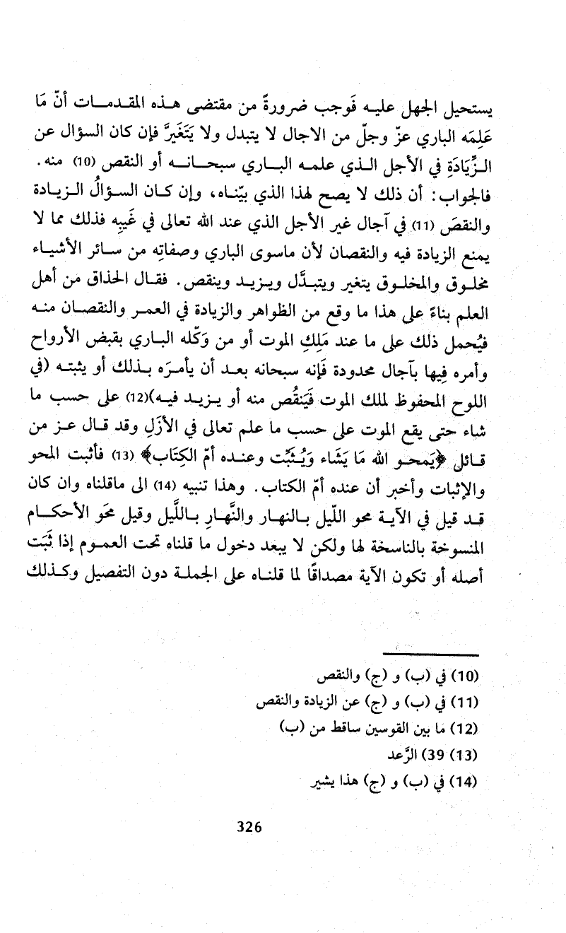 يستحيل الجهل عليه فَوجب ضرورةً من مقتضى هذه المقدمات أنّ مَا عَلِمَه الباري عزّ وجلّ من الاجال لا يتبدل ولا يَتَغَيرَّ فإن كان السؤال عن الزِّيَادَةِ في الأجل الذي علمه الباري سبحانه أو النقص (¬10) منه.