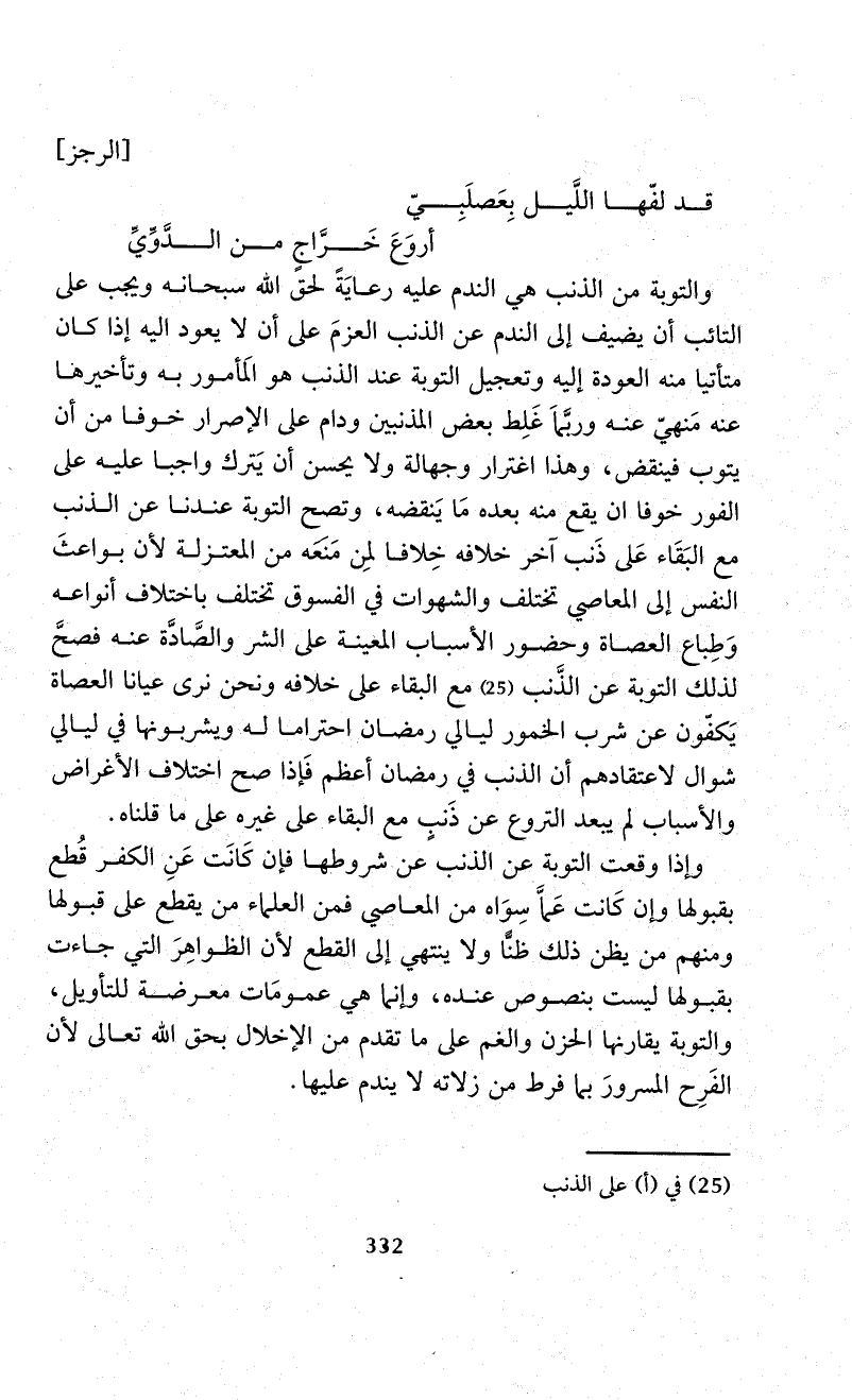 والتوبة من الذنب هي الندم عليه رعايَةً لحقً الله سبحانه ويجب على التائب أن يضيف إلى الندم عن الذنب العزمَ على أن لا يعود إليه إذا كان متأتيا منه العودة إليه وتعجيل التوبة عند الذنب هو المَأمور به وتأخيرها عنه مَنهيّ عنه وربَّماَ غَلِط بعض المذنبين ودام على الإصرار خوفا من أن يتوب فينقض، وهذا اغترار وجهالة ولا يحسن أن يَترك واجبا عليه على الفور خوفا ان يقع منه بعده مَا يَنقضه، وتصح التوبة عندنا عن الذنب مع البَقَاء عَلي ذَنب آخر خلافه خِلافا لمِن مَنَعَه من المعتزلة لأن بواعثَ النفس إلى المعاصي تختلف والشهوات في الفسوق تختلف باختلاف أنواعه وَطِباع العصاة وحضور الأسباب المعينة على الشر والصَّادَّة عنه فصحَّ لذلك التوبة عن الذَّنب (¬25) مع البقاء على خلافه ونحن نرى عيانا العصاة يَكفّون عن شرب الخمور ليالي رمضان احتراما له ويشربونها في ليالي شوال لاعتقادهم أن الذنب في رمضان أعظم فَإذا صح اختلاف الأغراض والأسباب لم يبعد التروع عن ذَنبٍ مع البقاء على غيره على ما قلناه.