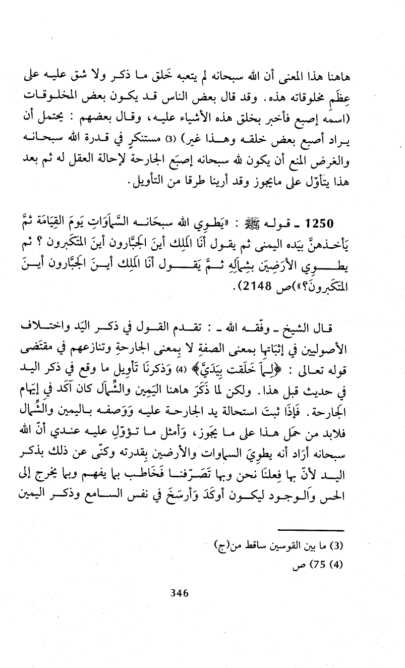 1250 - قوله - صلى الله عليه وسلم -: "يَطوِي الله سبحَانه السَّماَوَاتِ يَومَ القِيَامَة ثمَّ يَأخذهنَّ بيَده اليمنى ثم يقول أنَا المَلِك أينَ الجَبَّارون أينَ المتكَبرون؟ ثم يطوِي الأرَضِيَن بشِماَلِهِ ثمَّ يَقول أنَا المَلِك أينَ الجَبَّارون أينَ المتَكَبرونَ؟ " (ص 2148).