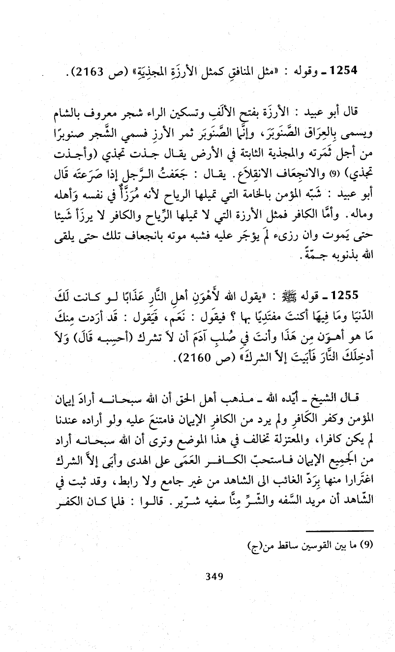 1254 - وقوله: "مثل المنافقِ كمثل الأرزَةِ المجذِيَةِ" (ص 2163).