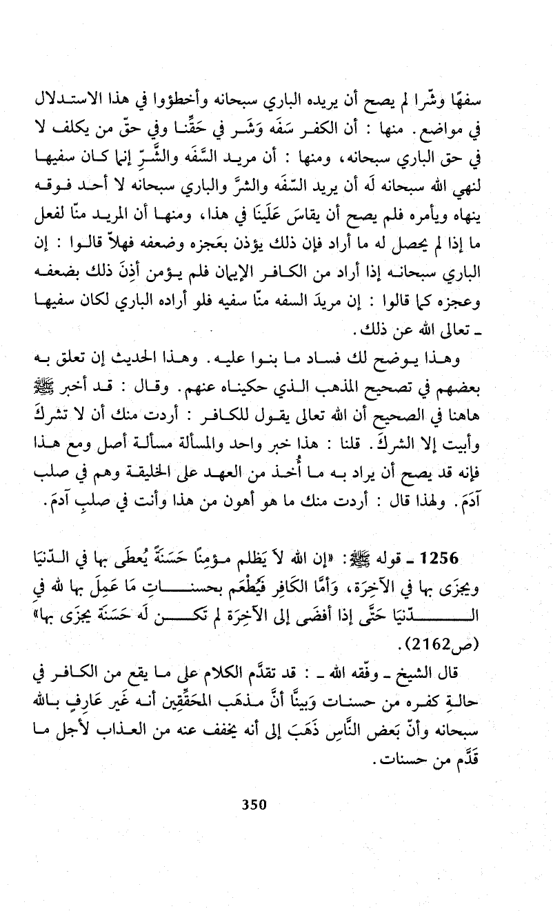 سفهاً وشّرا لم يصح أن يريده الباري سبحانه وأخطؤوا في هذا الاستدلال في مواضع. منها: أن الكفر سَفَه وَشَر في حَقِّنا وفي حقّ من يكلف لا في حق الباري سبحانه، ومنها: أن مريد السَّفَه والشَّرِّ إنما كان سفيها لنهي الله سبحانه لَه أن يريد السّفه والشرَّ والباري سبحانه لا أحد فوقه ينهاه ويأمره فلم يصح أن يقاسَ عَلَينَا في هذا، ومنها أن المريد منّا لفعل ما إذا لم يحصل له ما أراد فإن ذلك يؤذن بعَجزه وضعفه فهلاّ قالوا: إن الباري سبحانه إذا أراد من الكافر الإيمان فلم يؤمن أذِنَ ذلك بضعفه وعجزه كما قالوا: إن مريدَ السفه منّا سفيه فلو أراده الباري لكان سفيها -تعالى الله عن ذلك.