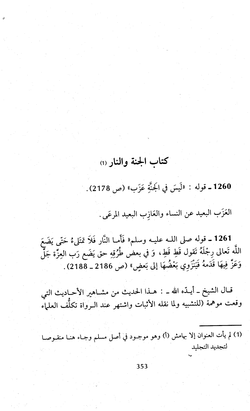 1261 - قوله صلى الله عليه وسلم "فَأَما النَّار فَلاَ تمتَلىءُ حَتّى يَضَع الله تَعالى رِجْلَهُ تَقول قَطِ قَطِ، وَفي بعض طُرُقِهِ حق يَضَع رَب العِزَّة جَلَّ وَعَزَّ فِيهَا قَدَمهُ فَيَنْزَوِي بَعْضُهَا إلى بَعضٍ" (ص 2186 - 2188).