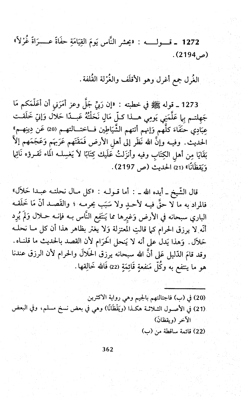 1272 - قوله: "يحشر النَّاس يَومَ القِيَامَةِ حفَاةً عرَاةً غُرْلاً" (ص 2194).