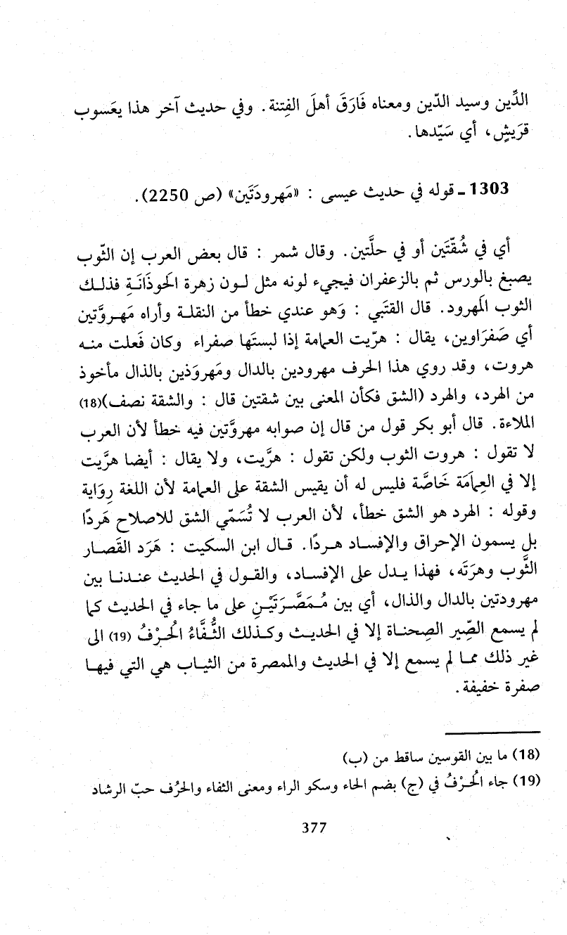 أي في شُقّتَين أو في حلَّتين. وقال شمر: قال بعض العرب إن الثّوب يصبغ بالورس ثم بالزعفران فيجيء لونه مثل لون زهرة الحَوذَانَةِ فذلك الثوب المَهرود. قال القتَبي: وَهو عندي خطأ من النقلة وأراه مَهروَّتين أي صَفرَاوين، يقال: هرّيت العمامة إذا لبستَها صفراء وكان فَعلت منه هروت، وقد روي هذا الحرف مهرودين بالدال ومَهروَذين بالذال مأخوذ من الهرد، والهرد (الشق فكأن المعنى بين شقتين قال: والشقة نصف) (¬18) الملاءة. قال أبو بكر قول من قال إن صوابه مهروَّتين فيه خطأ لأن العرب لا تقول: هروت الثوب ولكن تقول: هرَّيت، ولا يقال: أيضا هرَّيت إلا في العِماَمَة خَاصَّة فليس له أن يقيس الشقة على العمامة لأن اللغة رِوَاية وقوله: الهرد هو الشق خطأ، لأن العرب لا تُسَمّي الشق للإصلاح هَردًا بل يسمون الإحراق والإفساد هردًا. قال ابن السكيت: هَرَد القَصار الثَّوب وهرَتَه، فهذا يدل على الإفساد، والقول في الحديث عندنا بين مهرودتين بالدال والذال، أي بين مُمَصَّرَتَيْنِ على ما جاء في الحديث كما لم يسمع الصِّير الصِحناة إلا في الحديث وكذلك الثُّفَّاءُ الحُرْفُ (¬19) إلى غير ذلك مما لم يسمع إلا في الحديث والممصرة من الثياب هي التي فيها صفرة خفيفة.