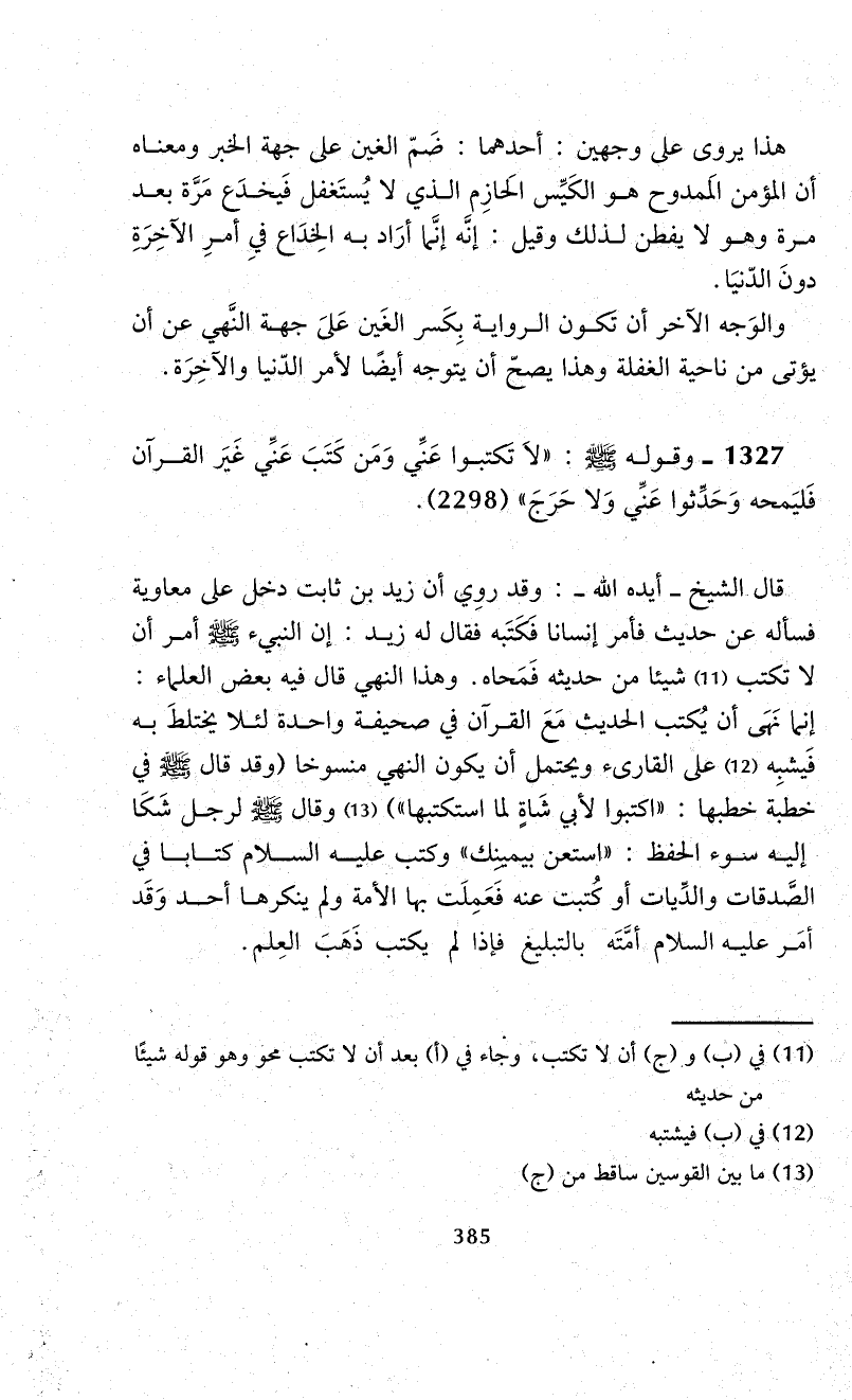 1327 - وقوله - صلى الله عليه وسلم -: "لاَ تكتبوا عَنِّي وَمَن كَتَبَ عَنِّي غَيَر القرآن فَليَمحه وَحَدِّثوا عَنِّي وَلا حَرَجَ" (ص 2298).