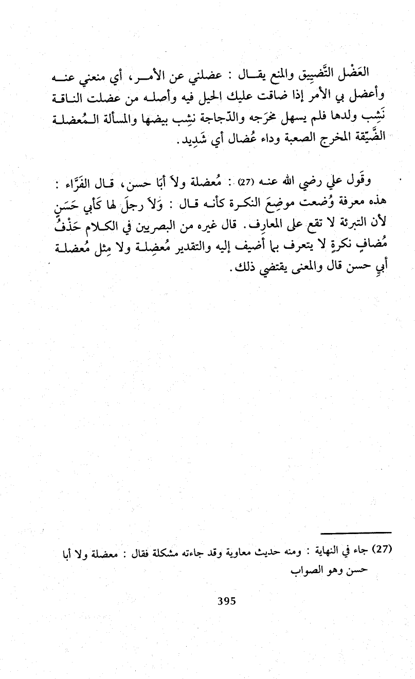 (¬27) جاء في النهاية: ومنه حديث معاوية وقد جاءته مشكلة فقال: معضلة ولا أبا حسن وهو الصواب.