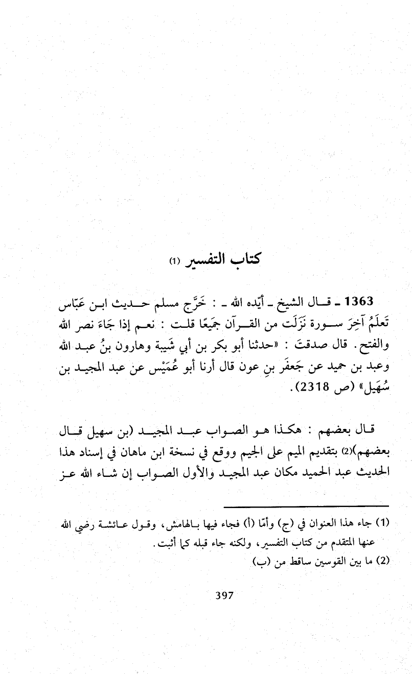 1363 - قال الشيخ -أيّده الله-: خَرَّج مسلم حديث ابن عَبّاس تَعلَمُ آخِرَ سورة نَزَلَت من القرآن جمَيعًا قلت: نعم إذا جَاءَ نصر الله والفتح. قال صدقتَ: "حدثنا أبو بكر بن أبي شَيبة وهارون بنُ عبد الله وعبد بن حميد عن جَعفَر بنِ عون قال أرنا أبو عُمَيْس عن عبد المجيد بن سُهَيل" (ص 2318).