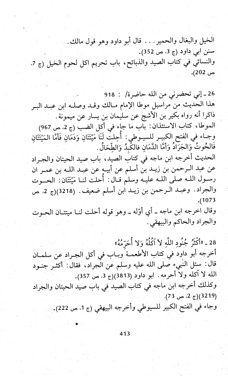 الموطأ، كتاب الاستئذان: باب ما جاء في أكل الضب (ج 2، ص 967) وجاء في الفتح الكبير للسيوطي: أُحِلت لَنَا مَيْتَتَانِ وَدَمَانِ فَأمَّا المَيْتَتَانِ فَالحُوتُ وَالجَرَادُ وَأمَّا الدَّمَانِ فالكَبدُ وَالطِّحَالُ.