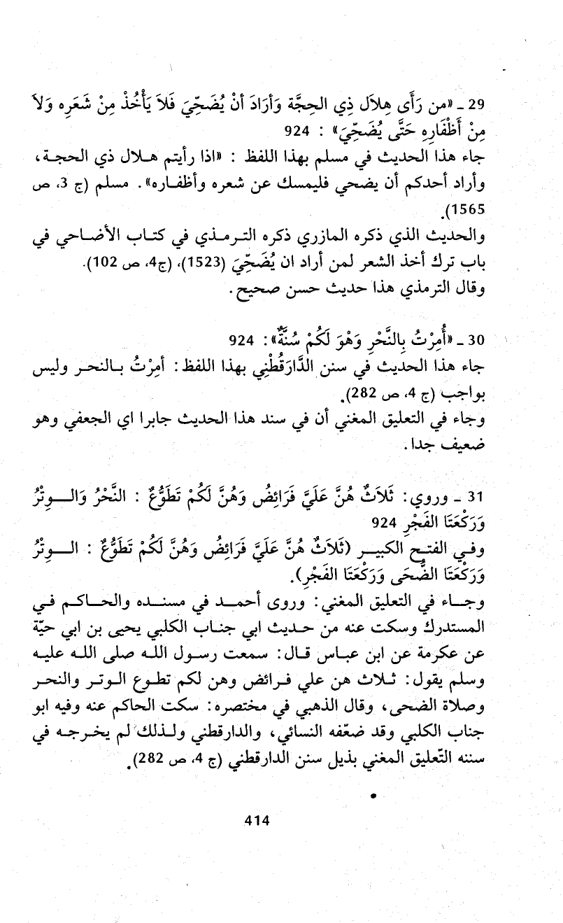 31 - وروي: ثَلاَثٌ هُنَّ عَلَيَّ فَرَائِضُ وَهُنَّ لَكُمْ تَطَوُّعٌ: النَّحْرُ وَالوِتْرُ وَرَكْعَتَا الفَجْرِ: 924.
