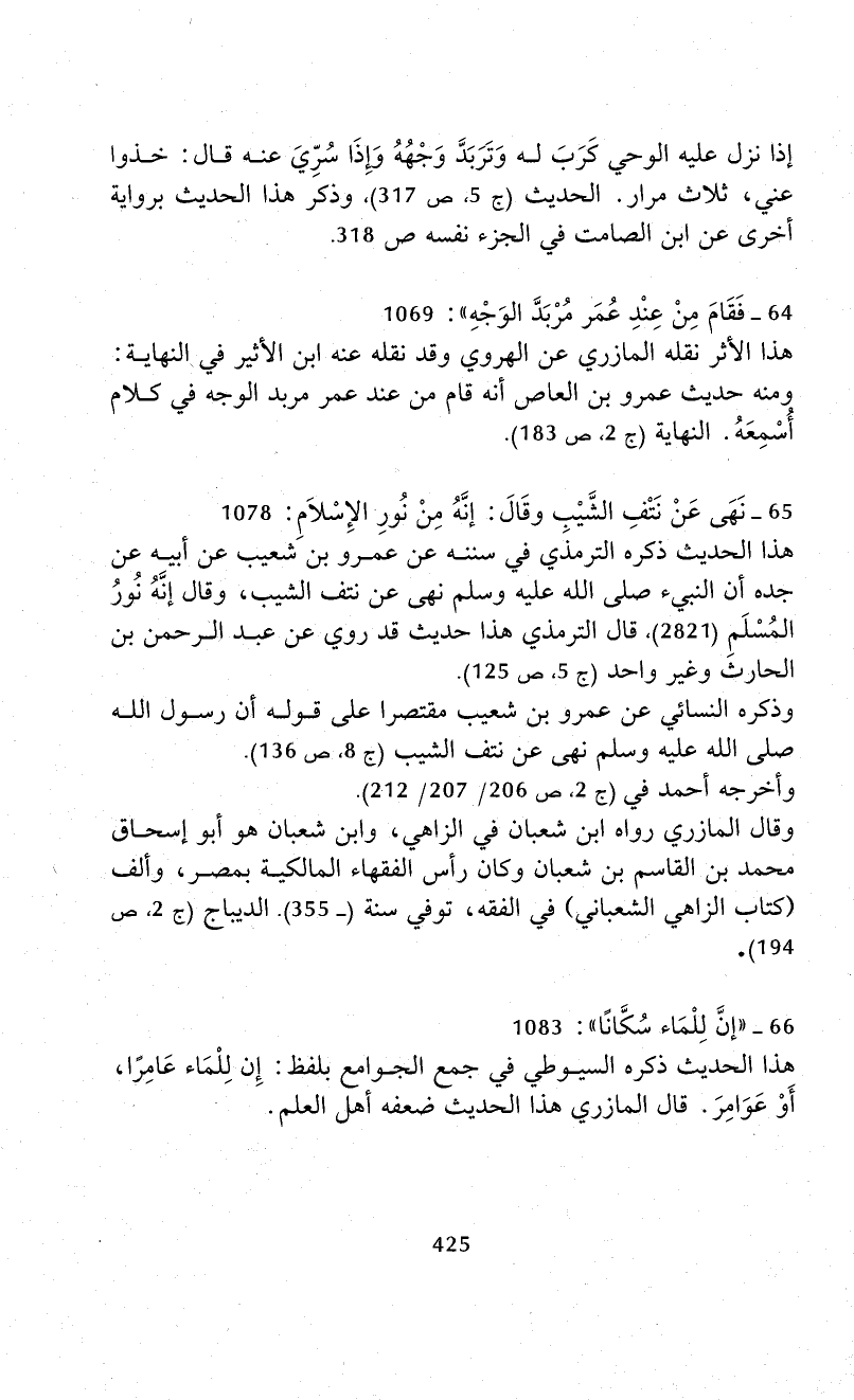 65 - نَهَى عَنْ نَتْفِ الشَّيْبِ وقَالَ: إنَّهُ مِنْ نُورِ الإِسْلاَمِ: 1078.