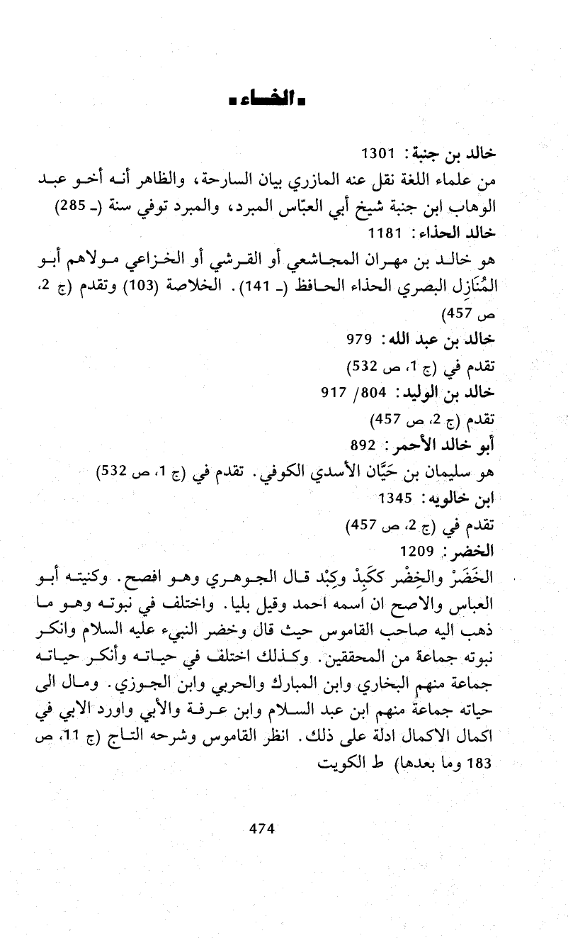 الخَضَرْ والخِضْر ككَبِدْ وكِبْد قال الجوهري وهو افصح. وكنيته أبو العباس والاصح أن اسمه أحمد وقيل بليا. وأختلف في نبوته وهو ما ذهب إليه صاحب القاموس حيث قال وخضر النبيء عليه السلام وانكر نبوته جماعة من المحققين. وكذلك اختلف في حياته وأنكر حياته جماعة منهم البخاري وابن المبارك والحربي وابن الجوزي. ومال إلى حياته جماعة منهم ابن عبد السلام وابن عرفة والأبي وأورد الأبي في اكمال الأكمال أدلة على ذلك. انظر القاموس وشرحه التاج (ج 11، ص 183 وما بعدها) ط الكويت.