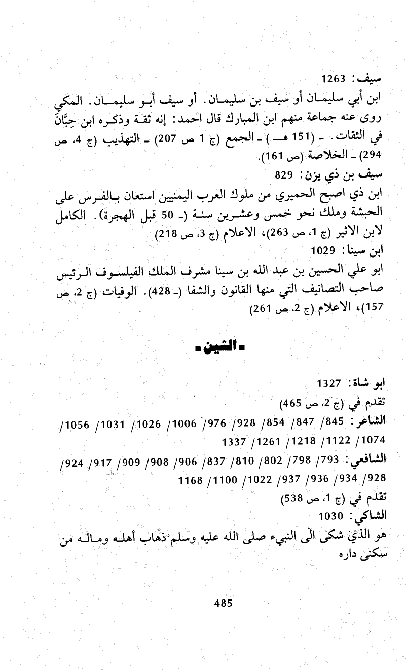أبو علي الحسين بن عبد الله بن سينا مشرف الملك الفيلسوف الرئيس صاحب التصانيف التي منها القانون والشفا (-428). الوفيات (ج 2، ص 157)، الأعلام (ج 2، ص 261).