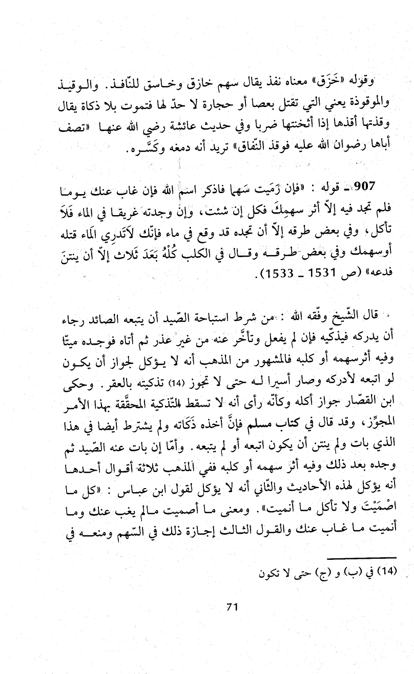 907 - قوله: "فإن رَمَيت سَهما فاذكر اسم الله فإن غاب عنك يوما فلم تجد فيه إلاّ أثر سهمِكَ فكل إن شئت، وإن وجدته غريقا في الماء فَلاَ تأكل، وفي بعض طرقه إلاّ أن تجده قد وقع في ماء فإنّك لاَ تَدرِي الَماء قتله أو سهمك وفي بعض طرقه وقال في الكلب كُلْهُ بَعَدَ ثَلاث إلاّ أن ينتنَ فدعه" (ص 1531 - 1533).