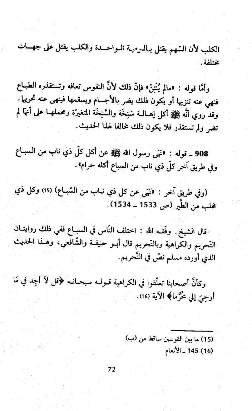 908 - قوله: "نهَىَ رسول الله - صلى الله عليه وسلم - عن أكل كلّ ذي ناب من السباع وفي طريق آخر كلّ ذي ناب من السباع أكله حرام".