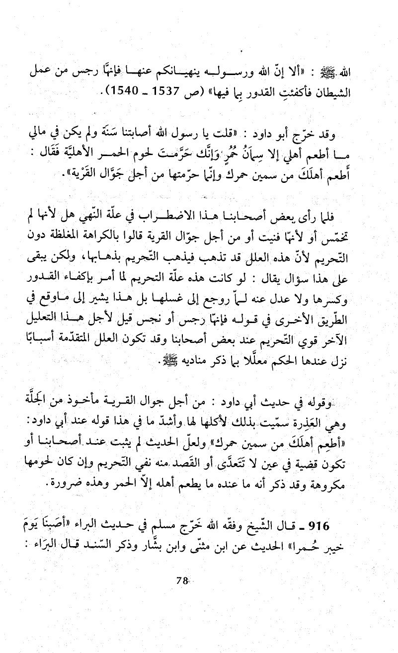الله - صلى الله عليه وسلم -: "ألا إنّ الله ورسوله ينهيانكم عنها فإنهَّا رجس من عمل الشيطان فأكفئتِ القدور بِما فيها" (ص 1537 - 1540).