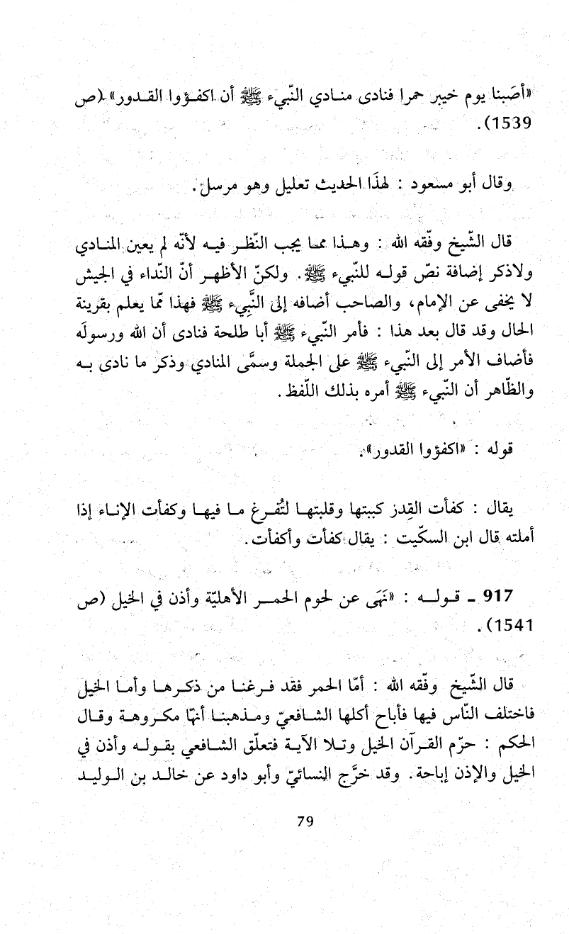 "أصَبنا يوم خيبر حمرا فنادى منادي النّبيء - صلى الله عليه وسلم - أن اكفؤوا القدور" (ص 1539).