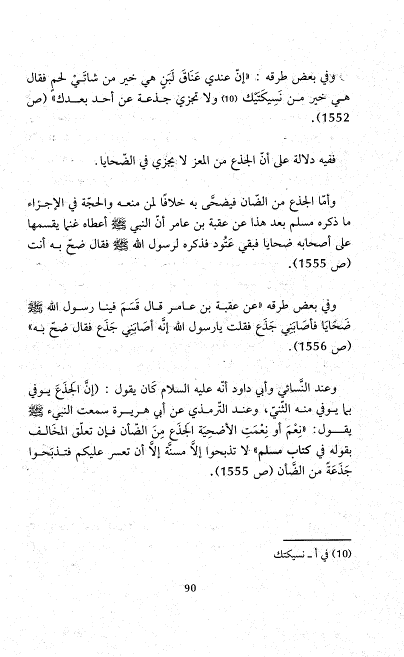 وعند النَّسائي وأبي داود أنّه عليه السلام كَان يقول: (إنَّ الجذَعَ يوفي بما يوفي منه الثّنيّ، وعند التّرمذي عن أبي هريرة سمعت النبيء - صلى الله عليه وسلم - يقول: "نِعْمَ أو نِعْمَتِ الأضحِيَة الَجذَع مِنَ الضّأن فإن تعلّق المخَالف بقوله في كتاب مسلم" لا تذبحوا إلاَّ مسنَّة إلاَّ أن تعسر عليكم فتذبَحوا جَذَعَةً من الضَّأن (ص 1555).