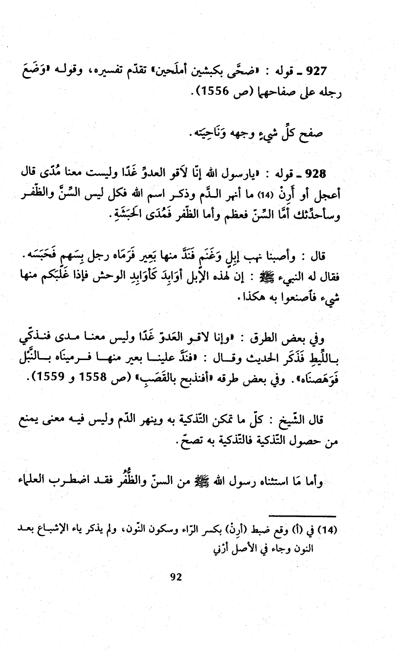 وفي بعض الطرق: "وإنا لاقو العَدوّ غَدّا وليس معنا مدى فنذكّي باللِّيطِ فَذَكَر الحديث وقال: "فنَدَّ علينا بعير عنها فرمينَاه بالنَّيْل فَوَهَصنَاه". وفي بعض طرقه "أفنذبح بالقَصَبِ" (ص 1558 و1559).