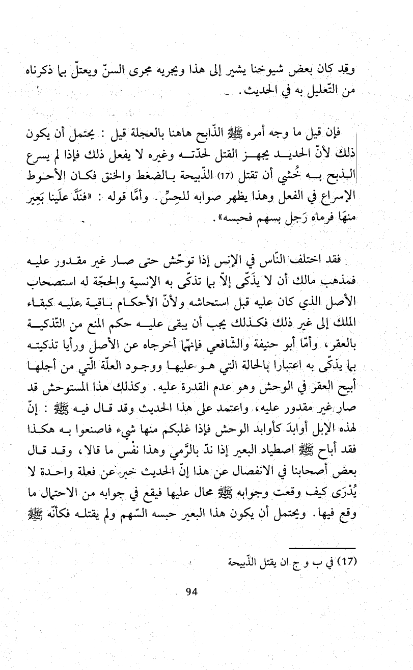 فإن قيل ما وجه أمره - صلى الله عليه وسلم - الذّابح ها هنا بالعجلة قيل: يحتمل أن يكون ذلك لأنّ الحديد يجهز القتل لحدّته وغيره لا يفعل ذلك فإذا لم يسرع الذبح به خُشي أن تقتل (¬17) الذّبيحة بالضغط والخنق فكان الأحوط الإسراع في الفعل وهذا يظهر صوابه للحِسِّ. وأمَّا قوله: "فنَدَّ علَينا بَعِير منهَا فرماه رَجل بسهم فحبسه".
