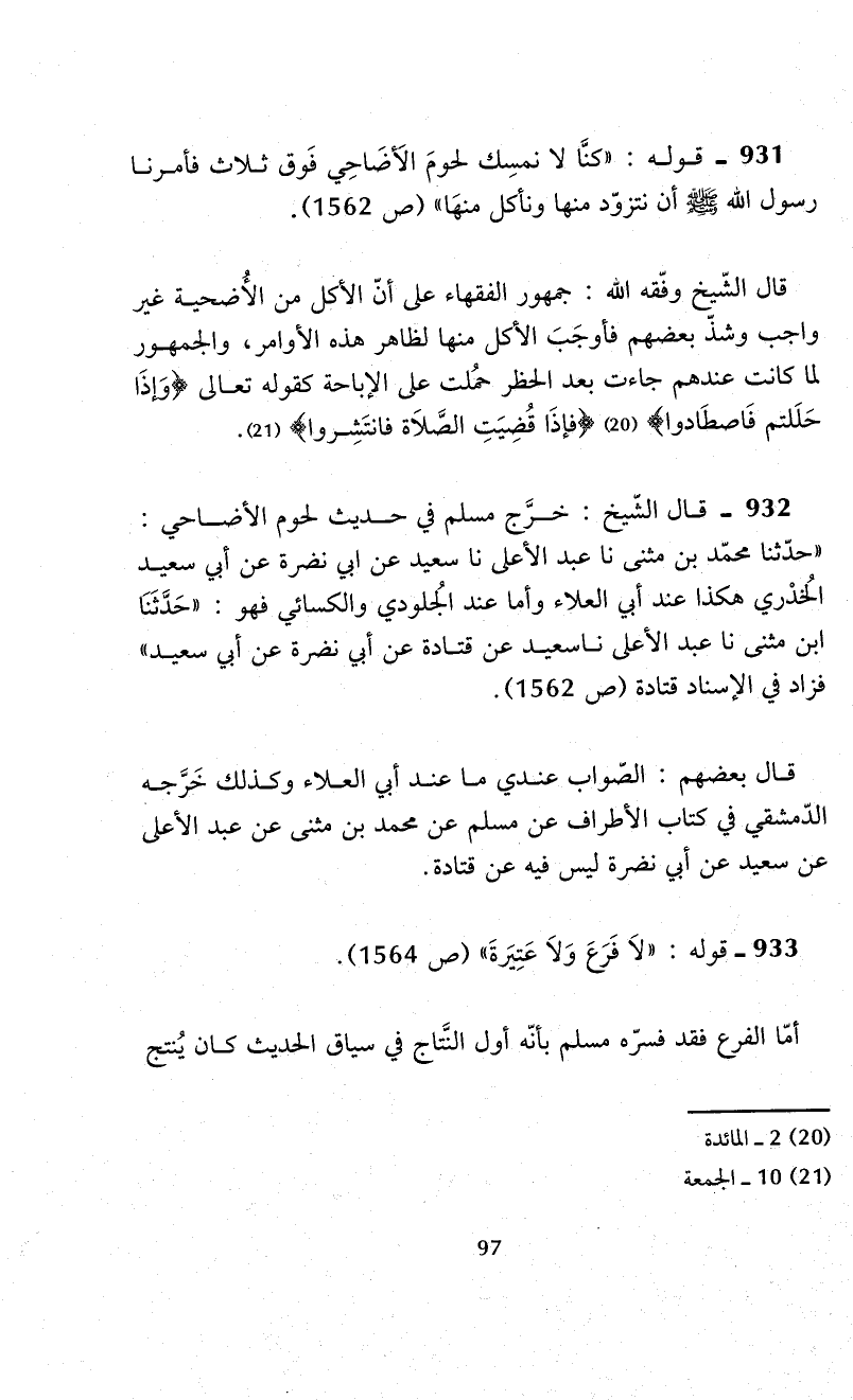931 - قوله: "كنَّا لا نمسِك لحومَ الَأضَاحِي فَوق ثلاث فأمرنا رسول الله - صلى الله عليه وسلم - أن نتزوّد منها ونأكل منهَا" (ص 1562).