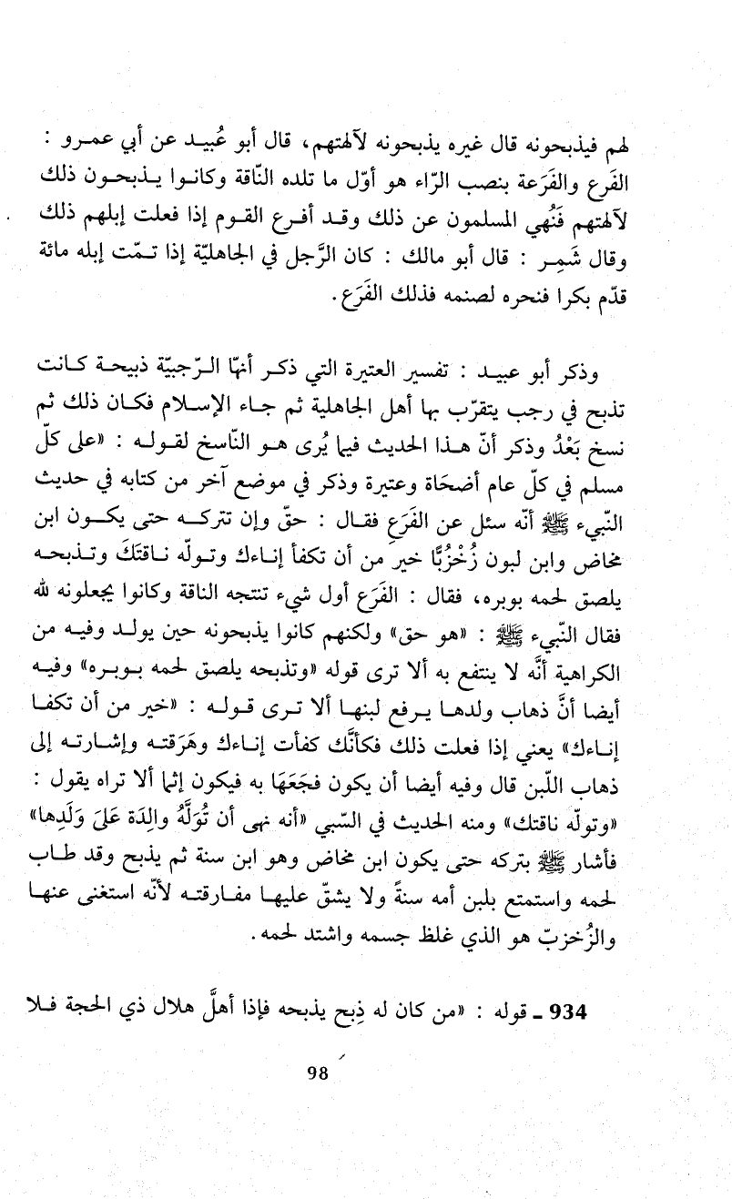 وذكر أبو عبيد: تفسير العتيرة التي ذكر أنهّا الرّجبيّة ذبيحة كانت تذبح في رجب يتقرّب بها أهل الجاهلية ثم جاء الإِسلام فكان ذلك ثم نسخ بَعْدُ وذكر أنّ هذا الحديث فيما يُرى هو النّاسخ لقوله: "على كلّ مسلم في كلّ عام أضحَاة وعتيرة وذكر في موضع آخر من كتابه في حديث النّبيء - صلى الله عليه وسلم - أنّه سئل عن الفَرَعِ فقال: حقّ وإن تتركه حتى يكون ابن مخاض وابن لبون زُخْزُيًّا خير من أن تكفأ إناءك وتولّه ناقتَكَ وتذبحه يلصق لحمه بوبره، فقال: الفَرَع أول شيء تنتجه الناقة وكانوا يجعلونه لله فقال النّبيء - صلى الله عليه وسلم -: "هو حق" ولكنهم كانوا يذبحونه حين يولد وفيه من الكراهية أنَّه لا ينتفع به ألا ترى قوله "وتذبحه يلصق لحمه بوبره" وفيه أيضاً أنَّ ذهاب ولدها يرفع لبنها ألا ترى قوله: "خير من أن تكفا إناءك" يعني إذا فعلت ذلك فكأنَّك كفأت إناءك وهَرَقته وإشارته إلى ذهاب اللّبن قال وفيه أيضاً أن يكون فجَعَهَا به فيكون إثما ألا تراه يقول: "وتولّه ناقتك" ومنه الحديث في السّبي "أنه نهى أن تُوَلَّهُ والِدَة عَلىَ وَلَدِها" فأشار - صلى الله عليه وسلم - بتركه حتى يكون ابن مخاض وهو ابن سنة ثم يذبح وقد طاب لحمه واستمتع بلبن أمه سنةً ولا يشقّ عليها مفارقته لأنّه استغنى عنها والزُخزبّ هو الذي غلظ جسمه واشتد لحمه.
