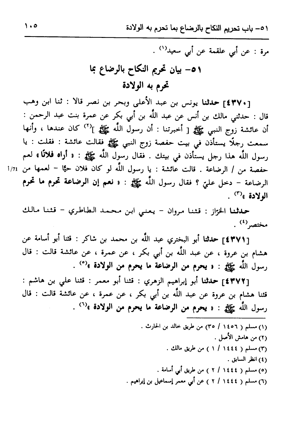 4370 - حَدَّثَنَا يُونُسُ بْنُ عَبْدِ الْأَعْلَى، وَبَحْرُ بْنُ نَصْرٍ، قَالَا: ثَنَا ابْنُ وَهْبٍ، قَالَ: حَدَّثَنِي مَالِكُ بْنُ أَنَسٍ، عَنْ عَبْدِ اللَّهِ بْنِ أَبِي بَكْرٍ، عَنْ عَمْرَةَ بِنْتِ عَبْدِ الرَّحْمَنِ، أَنَّ عَائِشَةَ، زَوْجَ النَّبِيِّ صَلَّى اللهُ عَلَيْهِ وَسَلَّمَ أَخْبَرَتْنَا أَنَّ رَسُولَ اللَّهِ صَلَّى اللهُ عَلَيْهِ وَسَلَّمَ كَانَ عِنْدَهَا، وَأَنَّهَا سَمِعَتْ رَجُلًا يَسْتَأْذِنُ فِي بَيْتِ حَفْصَةَ زَوْجِ النَّبِيِّ صَلَّى اللهُ عَلَيْهِ وَسَلَّمَ، فَقَالَتْ عَائِشَةُ: فَقُلْتُ: يَا رَسُولَ اللَّهِ، هَذَا رَجُلٌ يَسْتَأْذِنُ فِي بَيْتِكَ، فَقَالَ رَسُولُ اللَّهِ صَلَّى اللهُ عَلَيْهِ وَسَلَّمَ: «أُرَاهُ فُلَانًا» لِعَمِّ حَفْصَةَ مِنَ الرَّضَاعَةِ، قَالَتْ عَائِشَةُ: يَا رَسُولَ اللَّهِ، لَوْ كَانَ فُلَانٌ حَيًّا لِعَمِّهَا مِنَ الرَّضَاعَةِ دَخَلَ عَلَيَّ؟ فَقَالَ رَسُولُ اللَّهِ صَلَّى اللهُ عَلَيْهِ وَسَلَّمَ: «§نَعَمْ إِنَّ الرَّضَاعَةَ تُحَرِّمُ مَا تُحَرِّمُ الْوِلَادَةُ» حَدَّثَنَا الْخَرَّازُ قَثَنَا مَرْوَانُ يَعْنِي ابْنَ مُحَمَّدٍ الطَّاطَرِيَّ قَثَنَا مَالِكٌ، مُخْتَصَرًا