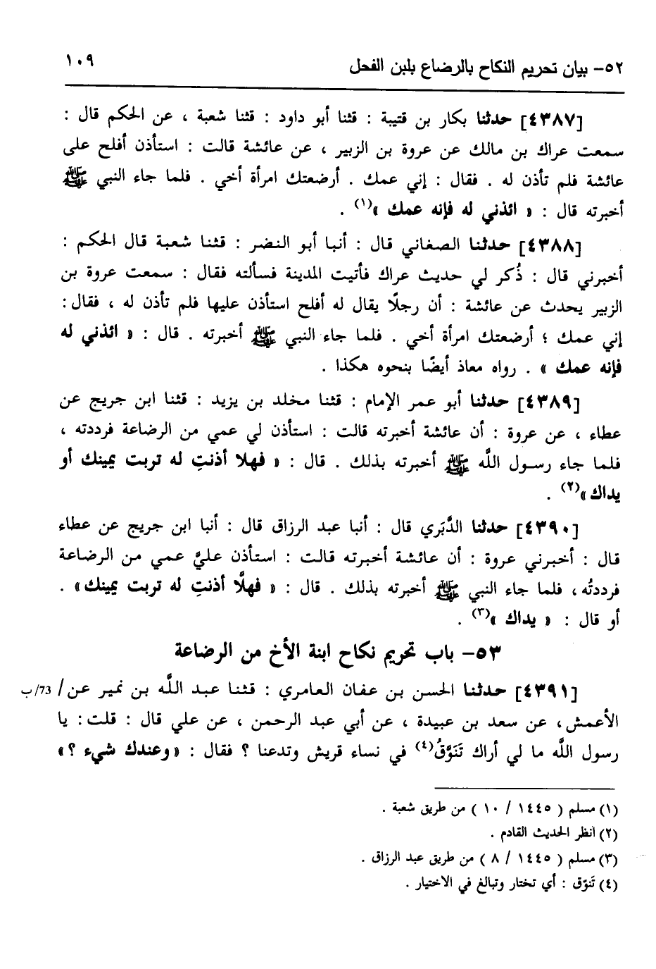 4388 - حَدَّثَنَا الصَّغَانِيُّ، قَالَ: أنبا أَبُو النَّضْرِ، قَثَنَا شُعْبَةُ، قَالَ الْحَكَمُ: أَخْبَرَنِي قَالَ: ذُكِرَ لِي حَدِيثُ عِرَاكٍ فَأَتَيْتُ الْمَدِينَةَ، فَسَأَلْتُهُ، فَقَالَ: سَمِعْتُ عُرْوَةَ بْنَ الزُّبَيْرِ يُحَدِّثُ، عَنْ عَائِشَةَ أَنَّ رَجُلًا يُقَالُ لَهُ أَفْلَحُ اسْتَأْذَنَ عَلَيْهَا، فَلَمْ تَأْذَنْ لَهُ، فَقَالَ: §إِنِّي عَمُّكِ أَرْضَعَتْكِ امْرَأَةُ أَخِي، فَلَمَّا جَاءَ النَّبِيُّ صَلَّى اللهُ عَلَيْهِ وَسَلَّمَ أَخْبَرَتْهُ، قَالَ: «ائْذَنِي لَهُ، فَإِنَّهُ عَمُّكِ» ، رَوَاهُ مُعَاذٌ أَيْضًا بِنَحْوِهِ هَكَذَا