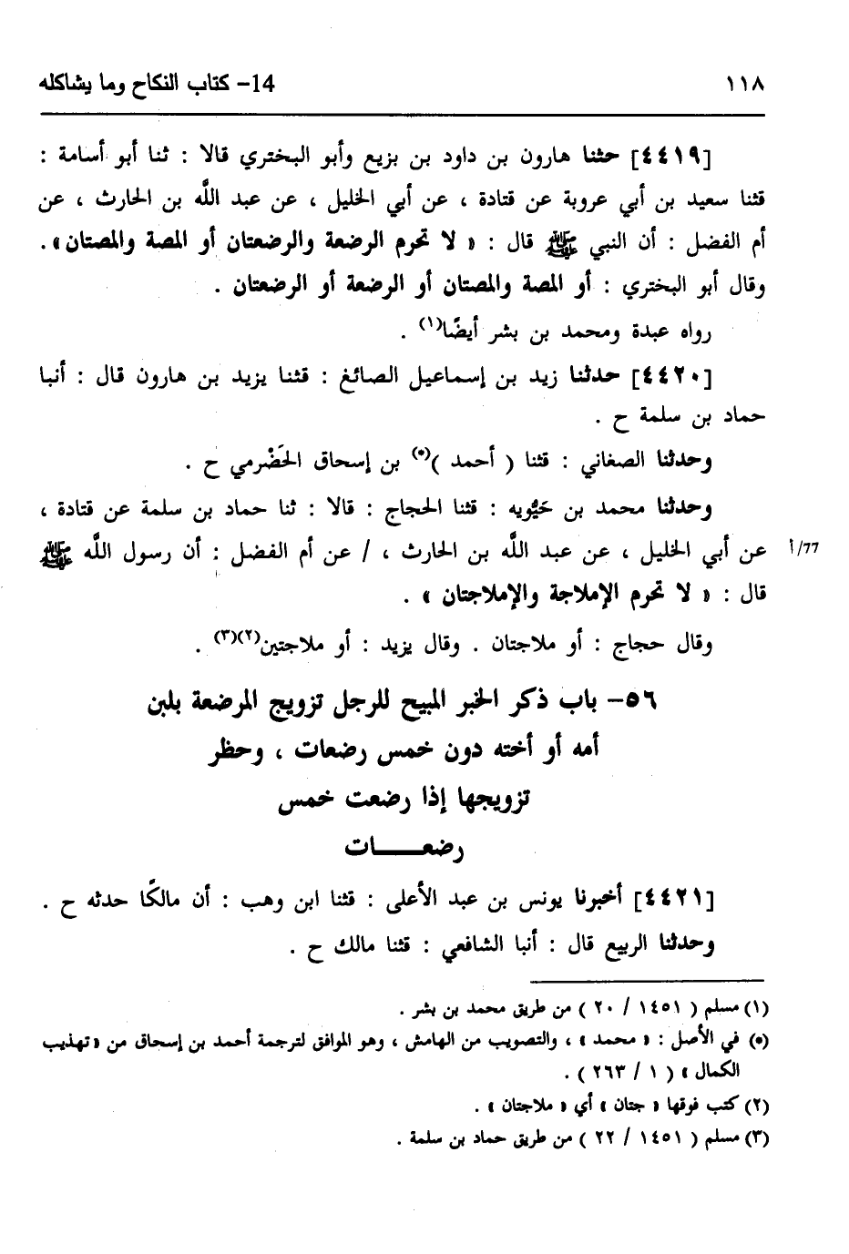 4419 - حثنا هَارُونُ بْنُ دَاوُدَ بْنِ بَزِيعٍ وَأَبُو الْبَخْتَرِيِّ، قَالَا: ثَنَا أَبُو أُسَامَةَ، قَثَنَا سَعِيدُ بْنُ أَبِي عَرُوبَةَ، عَنْ قَتَادَةَ، عَنْ أَبِي الْخَلِيلِ، عَنْ عَبْدِ اللَّهِ بْنِ الْحَارِثِ، عَنْ أُمِّ الْفَضْلِ، أَنَّ النَّبِيَّ صَلَّى اللهُ عَلَيْهِ وَسَلَّمَ قَالَ: «§لَا تُحَرِّمُ الرَّضْعَةُ وَالرَّضْعَتَانِ، أَوِ الْمَصَّةُ، وَالْمَصَّتَانِ» وَقَالَ أَبُو الْبَخْتَرِيِّ: «أَو الْمَصَّةُ، وَالْمَصَّتَانِ أَوِ الرَّضْعَةُ أَوِ الرَّضْعَتَانِ» رَوَاهُ عَبْدَةُ، وَمُحَمَّدُ بْنُ بِشْرٍ أَيْضًا