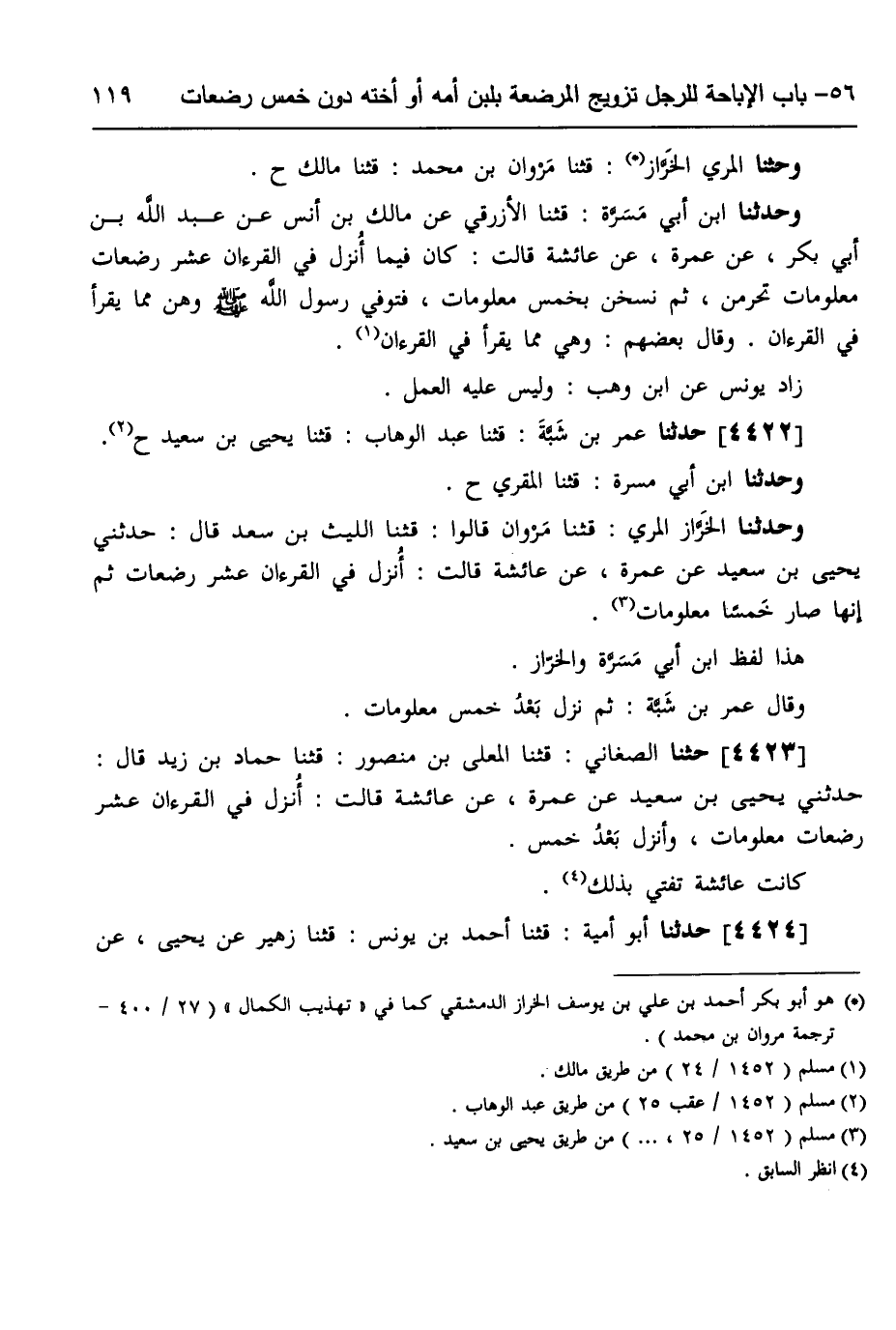 4423 - حثنا الصَّغَانِيُّ، قَثَنَا الْمُعَلَّى بْنُ مَنْصُورٍ، قَثَنَا حَمَّادُ بْنُ زَيْدٍ، قَالَ: حَدَّثَنِي يَحْيَى بْنُ سَعِيدٍ، عَنْ عَمْرَةَ، عَنْ عَائِشَةَ، قَالَتْ: «§أُنْزِلَ فِي الْقُرْآنِ عَشْرُ رَضَعَاتٍ مَعْلُومَاتٍ، وَأُنْزِلَ بَعْدُ خَمْسٌ» كَانَتْ عَائِشَةُ تُفْتِي بِذَلِكَ