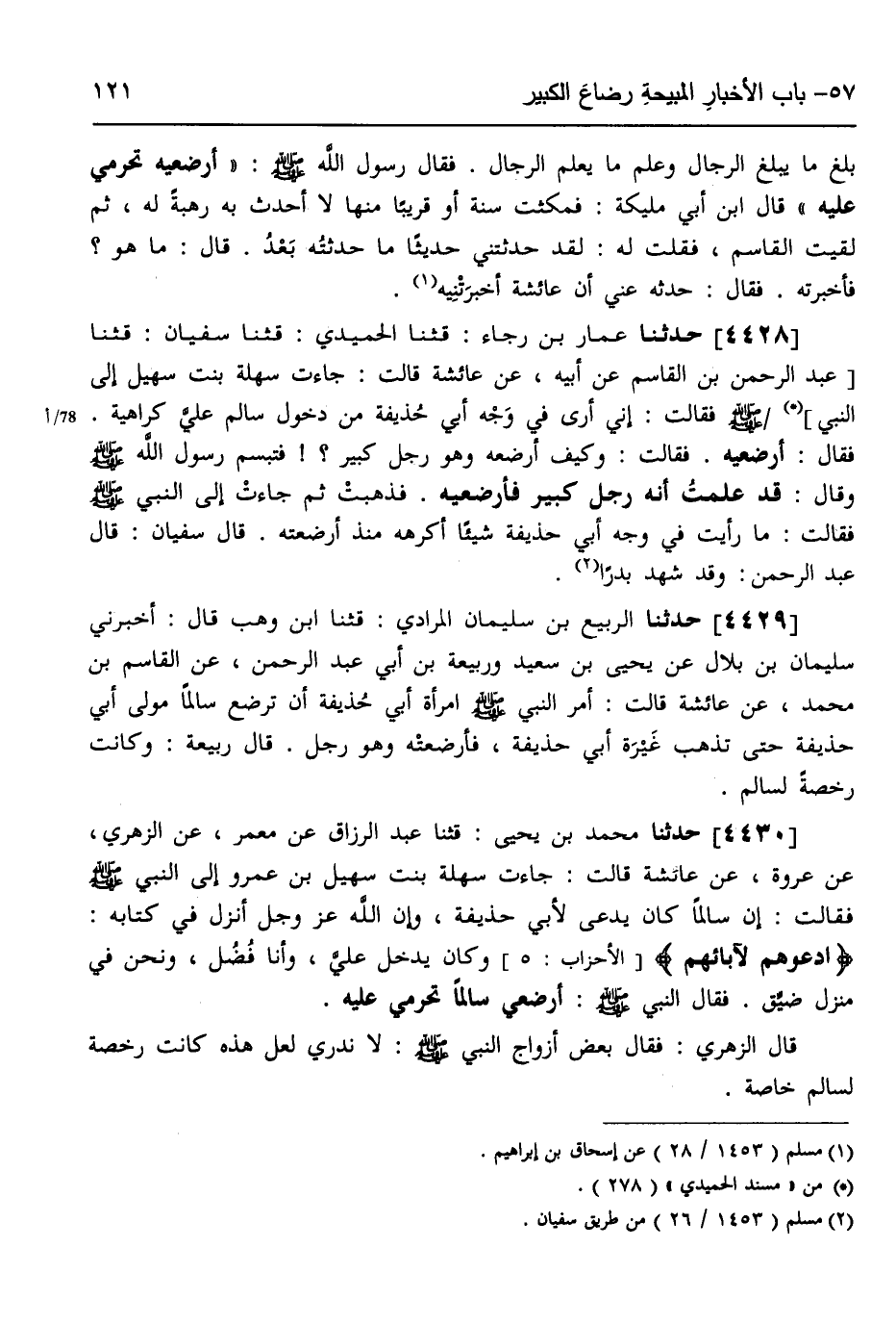 4428 - حَدَّثَنَا عَمَّارُ بْنُ رَجَاءٍ، قَثَنَا الْحُمَيْدِيُّ، قَثَنَا سُفْيَانُ، قَثَنَا عَبْدُ الرَّحْمَنِ بْنُ الْقَاسِمِ، عَنْ أَبِيهِ، عَنْ عَائِشَةَ، قَالَتْ: جَاءَتْ سَهْلَةُ بِنْتُ سُهَيْلٍ إِلَى النَّبِيِّ صَلَّى اللهُ عَلَيْهِ وَسَلَّمَ، فَقَالَتْ: إِنِّي §أَرَى فِي وَجْهِ أَبِي حُذَيْفَةَ مِنْ دُخُولِ سَالِمٍ عَلَيَّ كَرَاهِيَةً، فَقَالَ: «أَرْضِعِيهِ» ، فَقَالَتْ: وَكَيْفَ أُرْضِعُهُ وَهُوَ رَجُلٌ كَبِيرٌ؟ فَتَبَسَّمَ رَسُولُ اللَّهِ صَلَّى اللهُ عَلَيْهِ وَسَلَّمَ وَقَالَ: «قَدْ عَلِمْتُ أَنَّهُ رَجُلٌ كَبِيرٌ فَأَرْضِعِيهِ» ، فَذَهَبَتْ، ثُمَّ جَاءَتْ إِلَى النَّبِيِّ صَلَّى اللهُ عَلَيْهِ وَسَلَّمَ، فَقَالَتْ: مَا رَأَيْتُ فِي وَجْهِ أَبِي حُذَيْفَةَ شَيْئًا أَكْرَهُهُ مُنْذُ أَرْضَعْتُهُ، قَالَ سُفْيَانُ: قَالَ عَبْدُ الرَّحْمَنِ: وَقَدْ شَهِدَ بَدْرًا