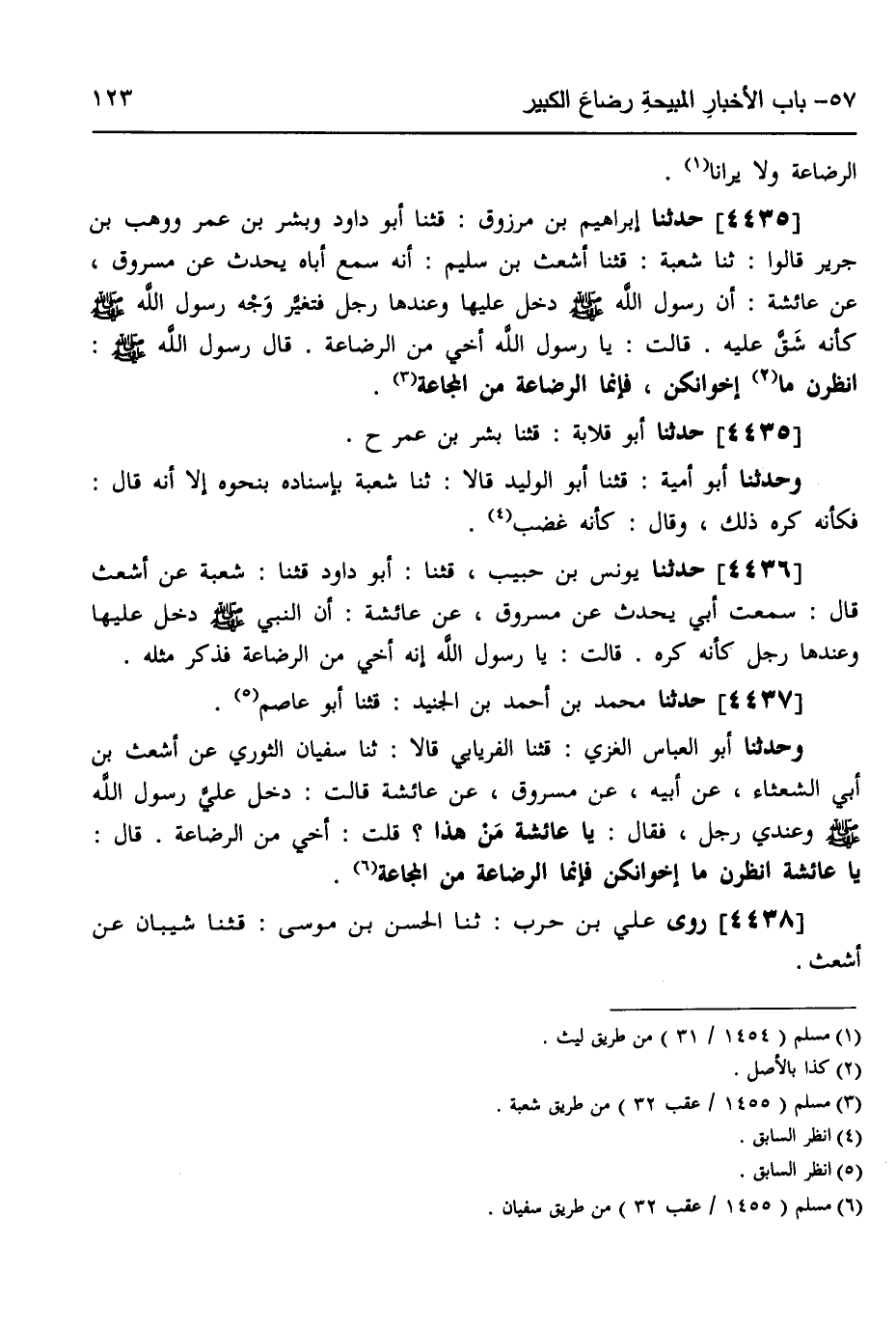 4435 - حَدَّثَنَا إِبْرَاهِيمُ بْنُ مَرْزُوقٍ، قَثَنَا أَبُو دَاوُدَ، وَبِشْرُ بْنُ عُمَرَ، وَوَهْبُ بْنُ جَرِيرٍ، قَالُوا: ثَنَا شُعْبَةُ، قَثَنَا أَشْعَثُ بْنُ سُلَيْمٍ، أَنَّهُ سَمِعَ أَبَاهُ، يُحَدِّثُ عَنْ مَسْرُوقٍ، عَنْ عَائِشَةَ، أَنَّ رَسُولَ اللَّهِ صَلَّى اللهُ عَلَيْهِ وَسَلَّمَ دَخَلَ عَلَيْهَا وَعِنْدَهَا رَجُلٌ، فَتَغَيَّرَ وَجْهُ رَسُولِ اللَّهِ صَلَّى اللهُ عَلَيْهِ وَسَلَّمَ، كَأَنَّهُ شَقَّ عَلَيْهِ، قَالَتْ: يَا رَسُولَ اللَّهِ، أَخِي مِنَ الرَّضَاعَةِ، قَالَ رَسُولُ اللَّهِ صَلَّى اللهُ عَلَيْهِ وَسَلَّمَ: «§انْظُرْنَ مَا إِخْوَانُكُنَّ، فَإِنَّمَا الرَّضَاعَةُ مِنَ الْمَجَاعَةِ» ، حَدَّثَنَا أَبُو قِلَابَةَ، قَثَنَا بِشْرُ بْنُ عُمَرَ، ح وَحَدَّثَنَا أَبُو أُمَيَّةَ، قَثَنَا أَبُو الْوَلِيدِ، قَالَا: ثَنَا شُعْبَةُ، بِإِسْنَادِهِ بِنَحْوِهِ إِلَّا أَنَّهُ قَالَ: «فَكَأَنَّهُ كَرِهَ ذَلِكَ» ، وَقَالَ: «كَأَنَّهُ غَضِبَ» ،